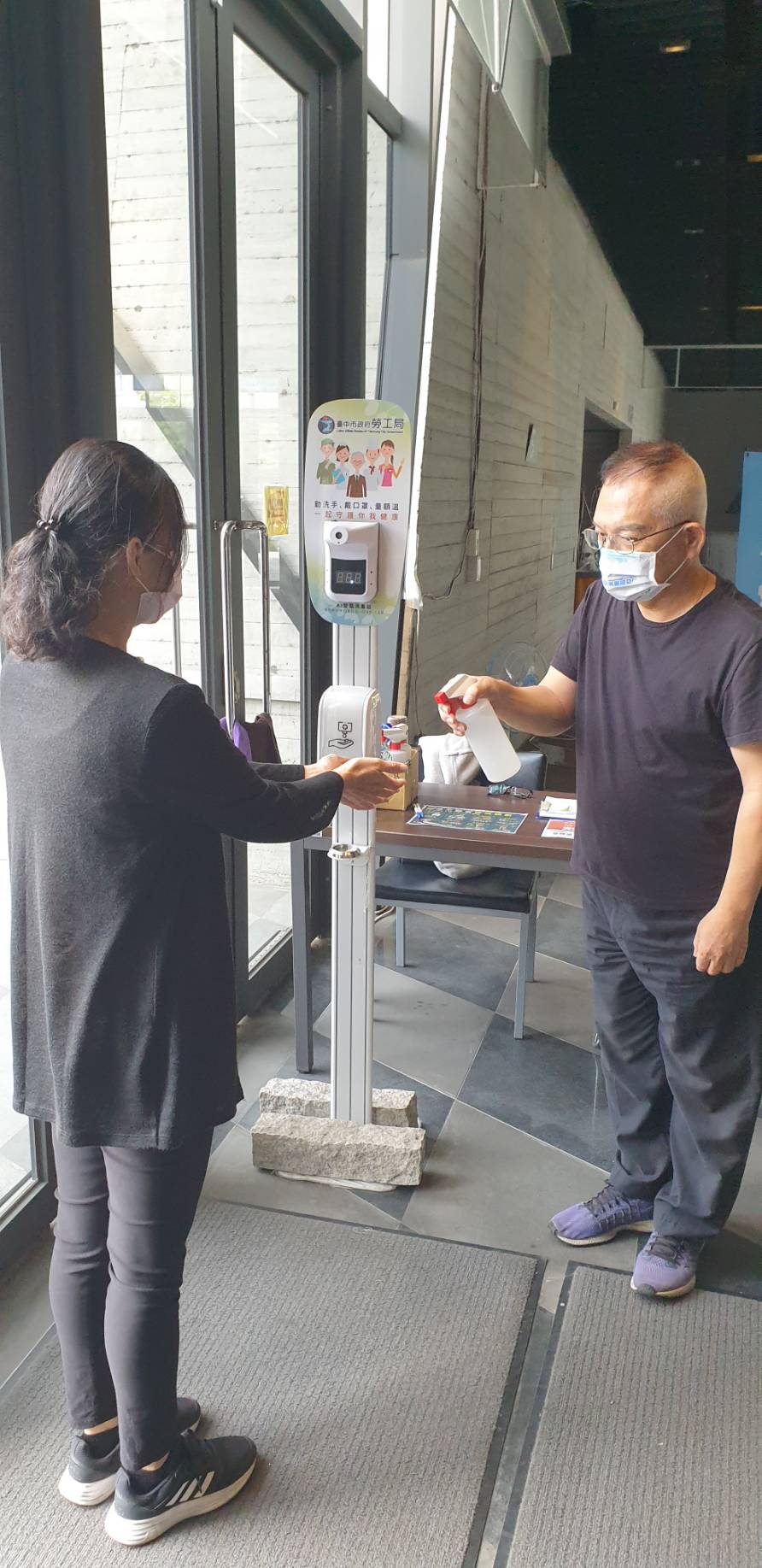 因應疫情升溫,台中市政府各機關現有超過2千多名擔任安心即時上工人員,協助公務機關執行環境消毒等防疫工作。為提升進用人員防疫保護措施,勞工局備好30萬片口罩及3千個酒精噴瓶發送給進用人員,並定期由專案管理人員電訪關懷其上工情形,為台中市防疫生力軍增加防疫能量。
