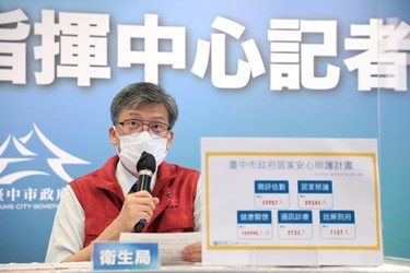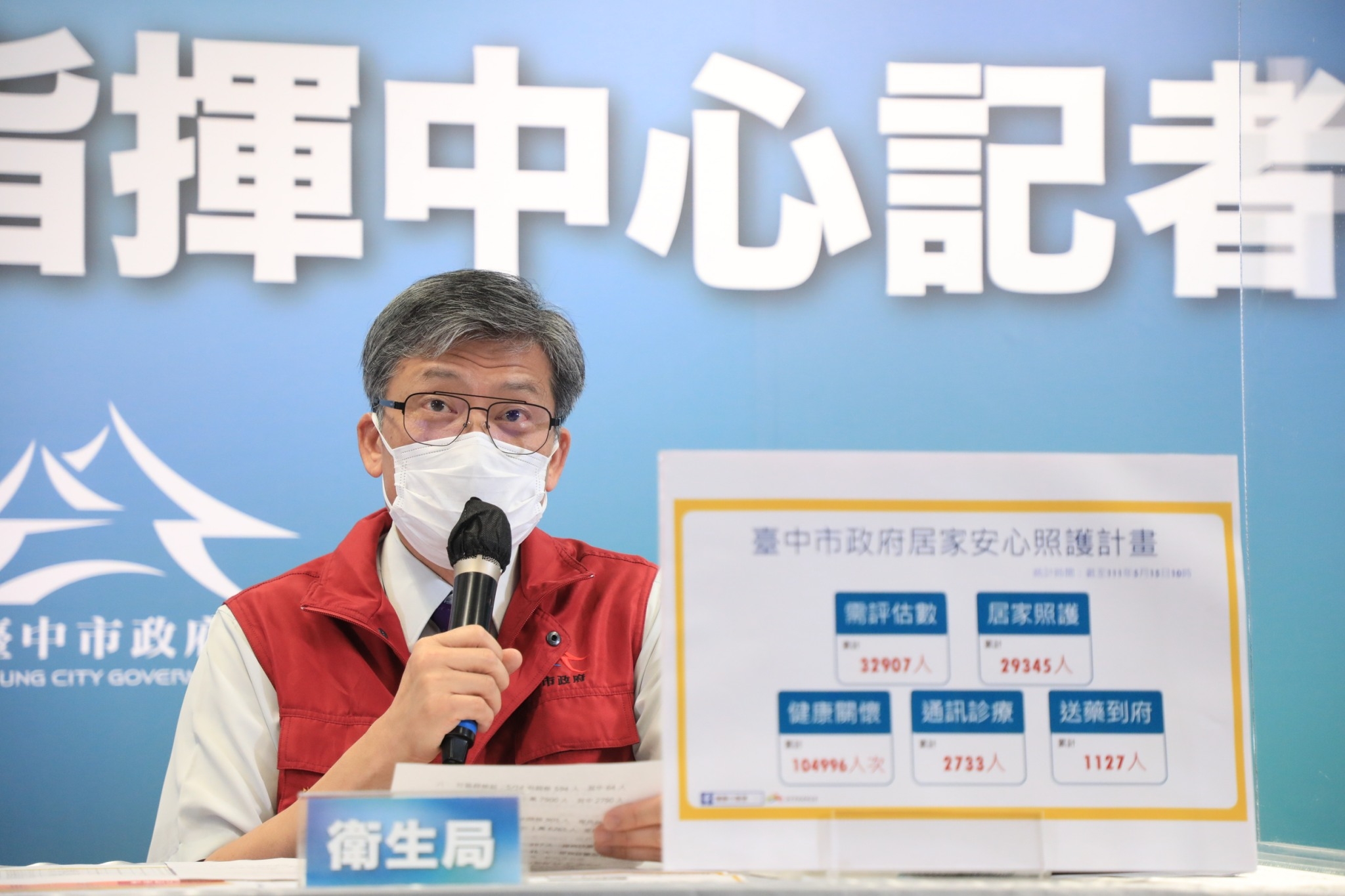有關台中市居家照護統計,盧市長說明,截至今日上午10時,累積有3萬2907位進行評估,其中2萬9345位(88.8%)已收案居家照護,累計健康關懷10萬4996人次,其中視訊診察2733人、送藥到府1127人、解除隔離9489人。