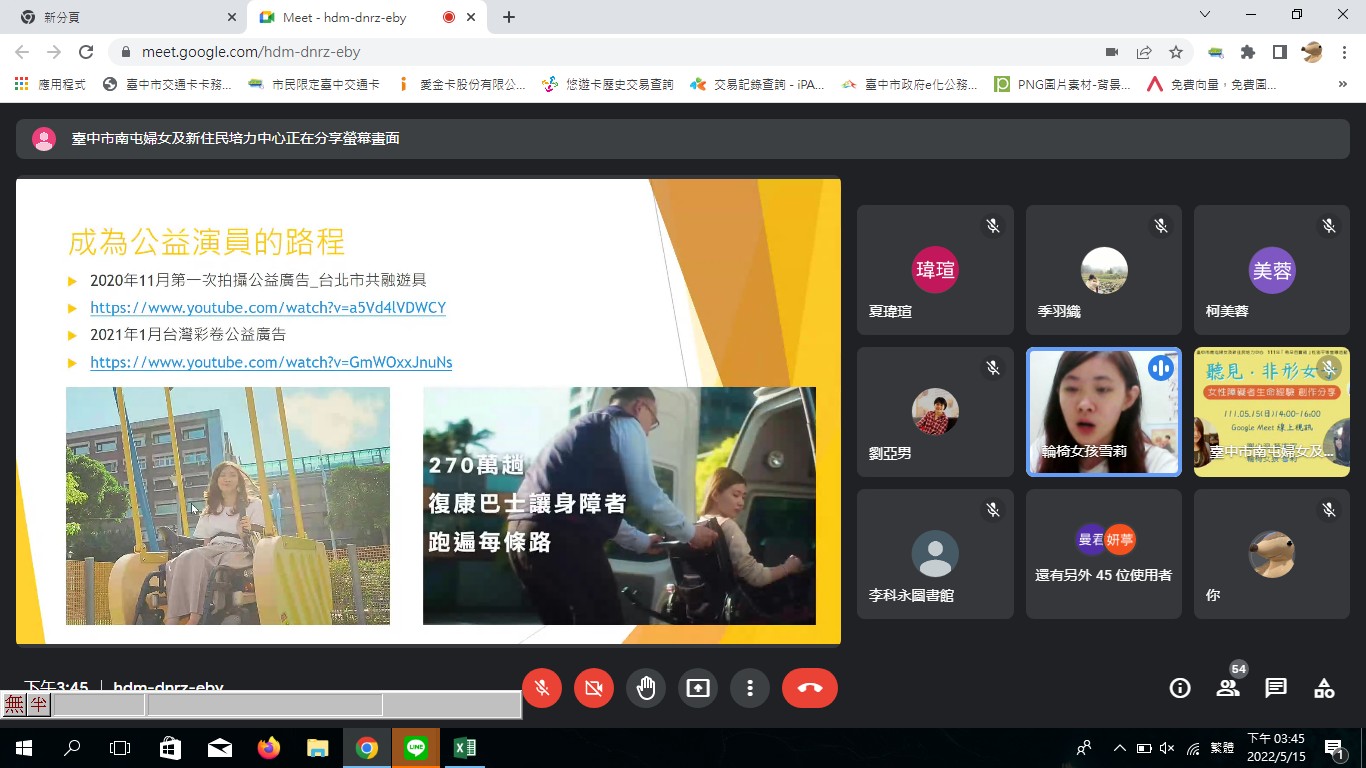 中市圖說明,「《看見‧非形女子》女性障礙者生命經驗圖文巡迴展」將在李科永紀念圖書分館展出至5月26日,第二場線上講座將於5月22日下午1點30分邀請本身為中度視障者的諮商心理師朱芯儀進行《「遇見‧非形女子」女性障礙者生命經驗分享》線上講座,屆時可透過google meet 線上參加,報名網址:https://forms.gle/R1cGAbPGTVtLpAR18,歡迎民眾踴躍報名。