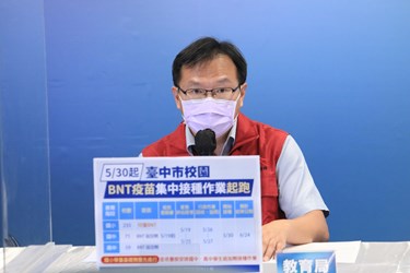 盧市長也提到,教育局從昨日起在國小與國、高中進行接種疫苗的接種須知及意願書印製工作,家長於明日之前能拿到接種須知及意願書,後續將依中央所規劃的期程,啟動台中市校園集中接種作業,此次接種對象將包含國小學童的基礎劑,以及國中、高中學生的第三劑(追加劑)。