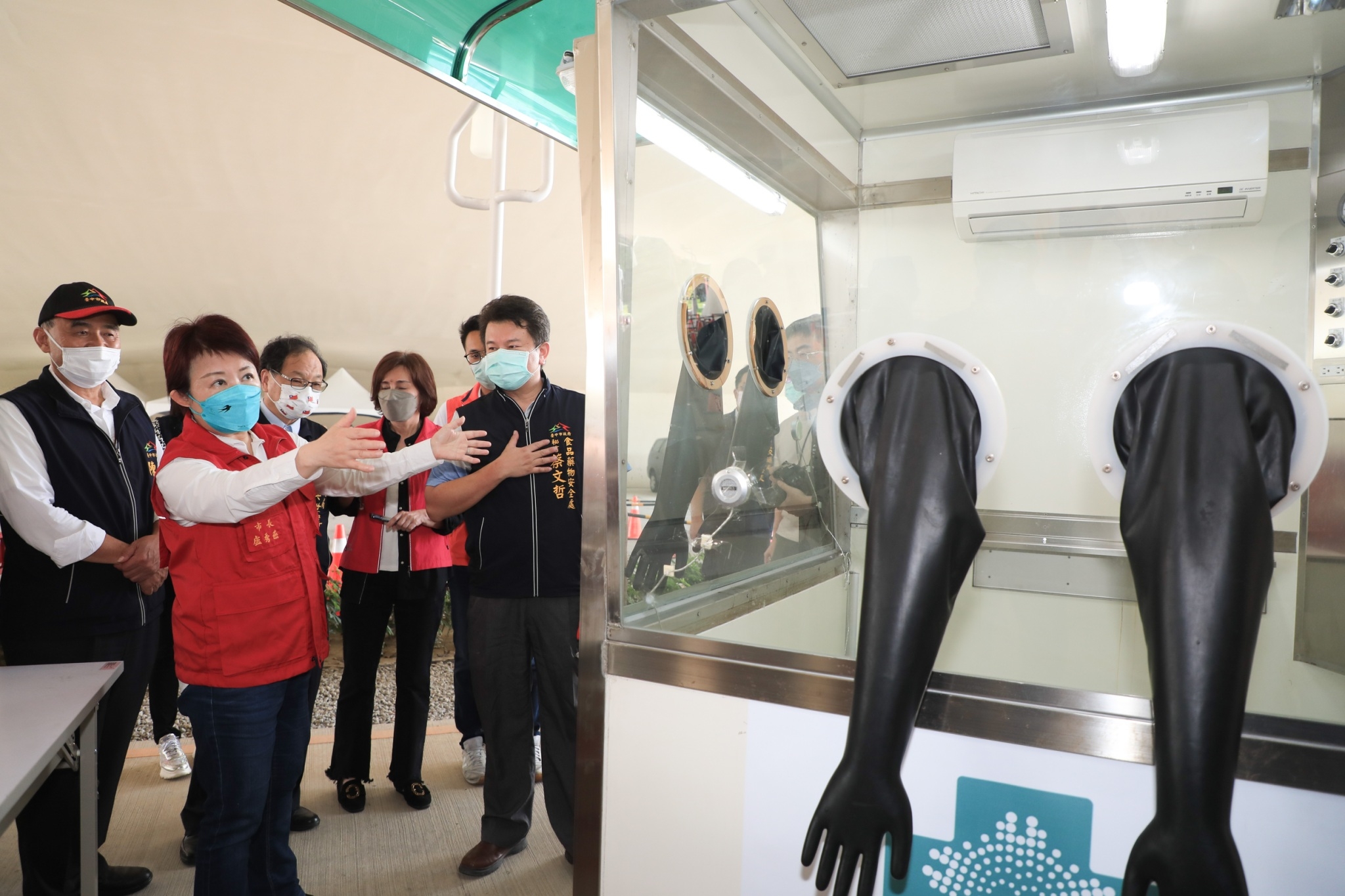 盧市長指出,國內確診數越來越多,民眾的篩檢需求也大增,為快速協助因疫情就醫的民眾,避免在醫院大排長龍,因此,市府與台中榮民總醫院、童綜合醫院共同合作。明日起於中央公園開始實施大型「PCR給藥得來速」機制。梧棲童綜合醫院大型篩檢站則已上路,服務居家快篩陽性或有症狀患者,篩檢站也設有親子得來速通道,避免家人帶著孩童重覆排隊。