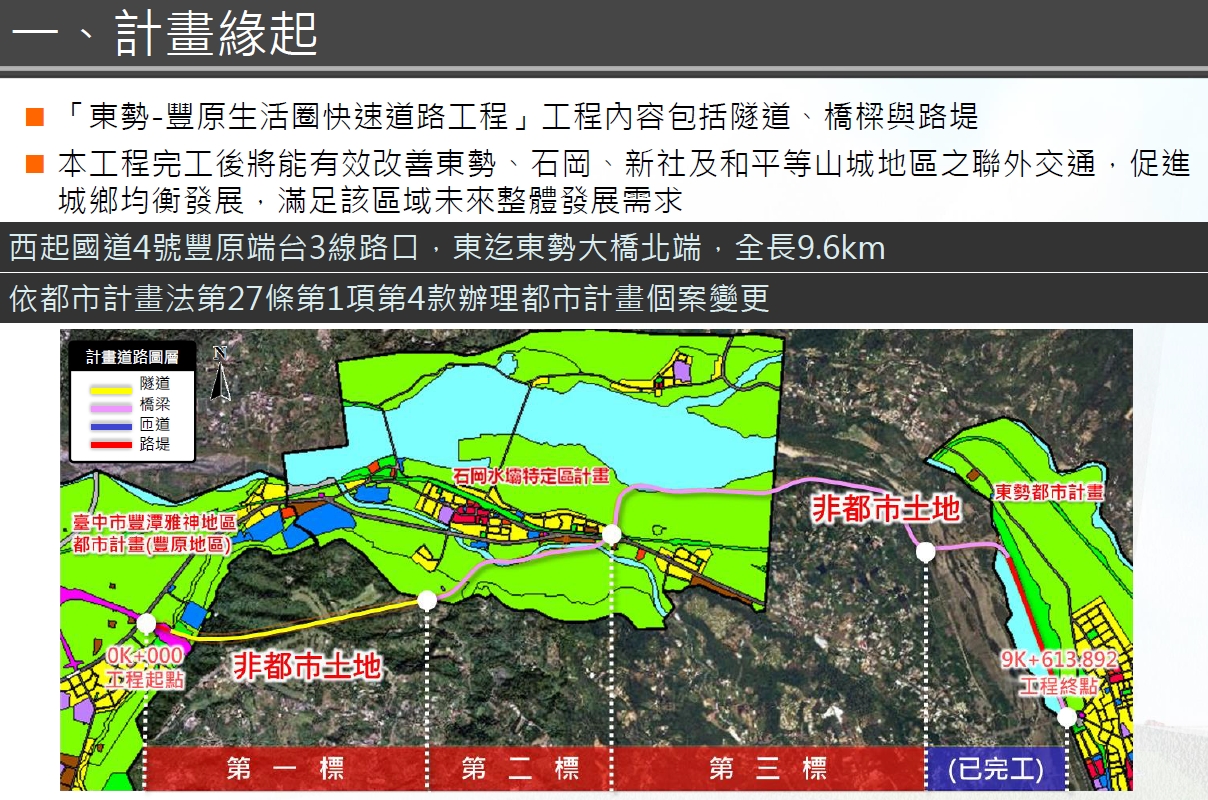 都發局說,「變更台中市豐潭雅神地區都市計畫主要計畫(配合東勢─豐原生活圈快速道路工程)案」及「變更石岡水壩特定區計畫(配合東勢─豐原生活圈快速道路工程)案」書圖資料可於都發局網站下載閱覽(https://www.ud.taichung.gov.tw/2044377/post)。(5/21*17)*都發局