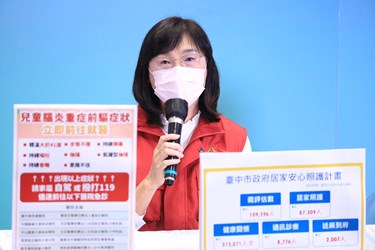 有關台中市居家照護統計,衛生局副局長邱惠慈指出,截至今日上午10時,累積有10萬9596位進行評估,其中8萬7309位已收案居家照護,累計健康關懷31萬3071人次,其中通訊診療8776人、送藥到府2007人、解除隔離5萬3194人。她補充說明,台中市今日新增12位確診中重症個案,年齡介於6歲至93歲,11位入住加護病房、8位插管治療、4位使用藥物治療;12位中重症個案當中11位有慢性病史,5位沒有接種疫苗、3位接種一劑、1位接種兩劑、3位接種三劑。