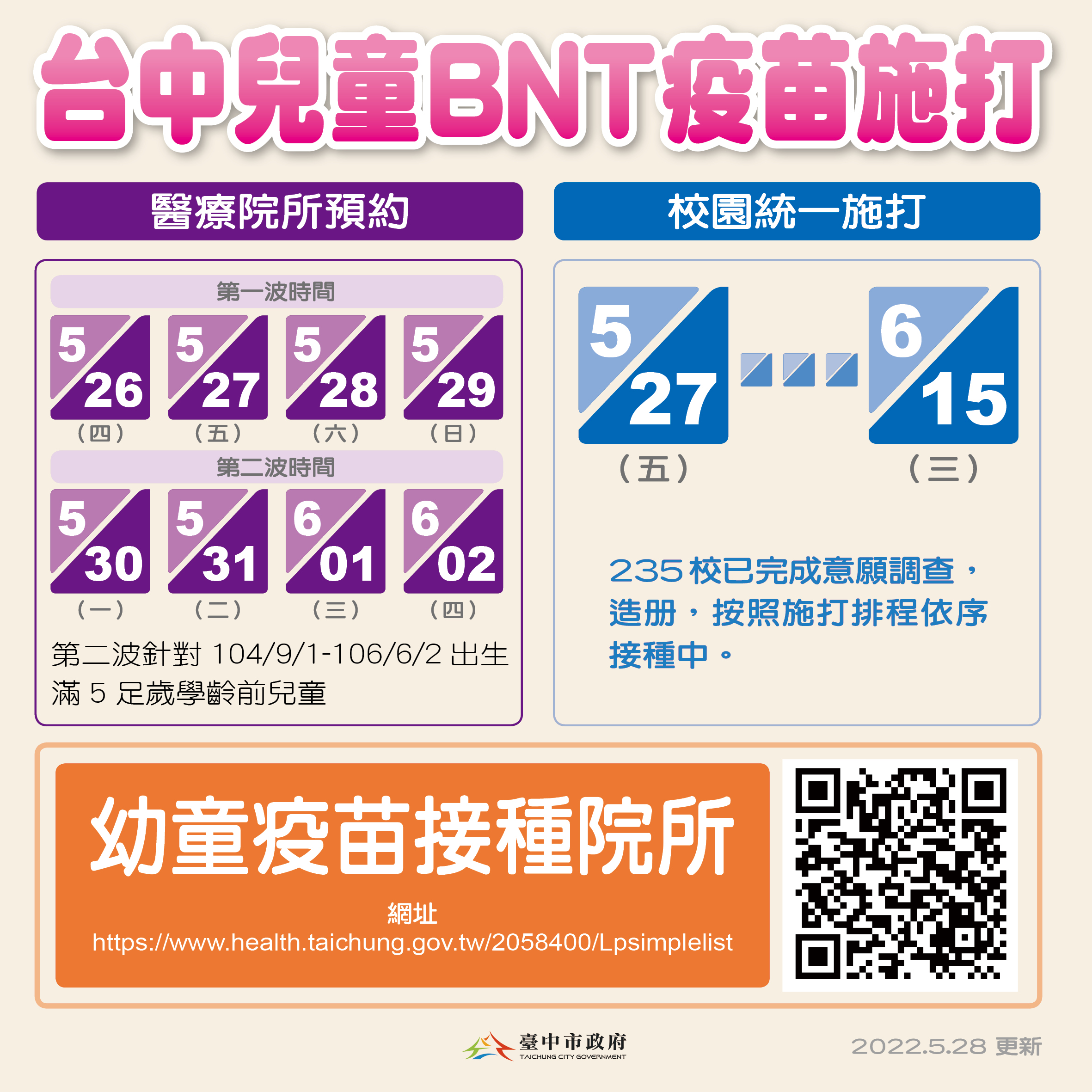 針對外界關心兒童BNT疫苗不夠施打問題,市長盧秀燕昨(27)日表示,已再向中央爭取到1.2萬劑疫苗,將全數分配給醫療院所展開第二波注射作業,因此,台中市將於5/30至6/2連開四天醫療院所預約施打,接種對象是104/9/1至106/6/2出生之滿5足歲學齡前的幼兒。先前第一波醫療院所預約施打是5/26-5/29,兩波期程連在一起,等於台中市醫療院所自5/26起至6/2,連續8天都可預約施打。