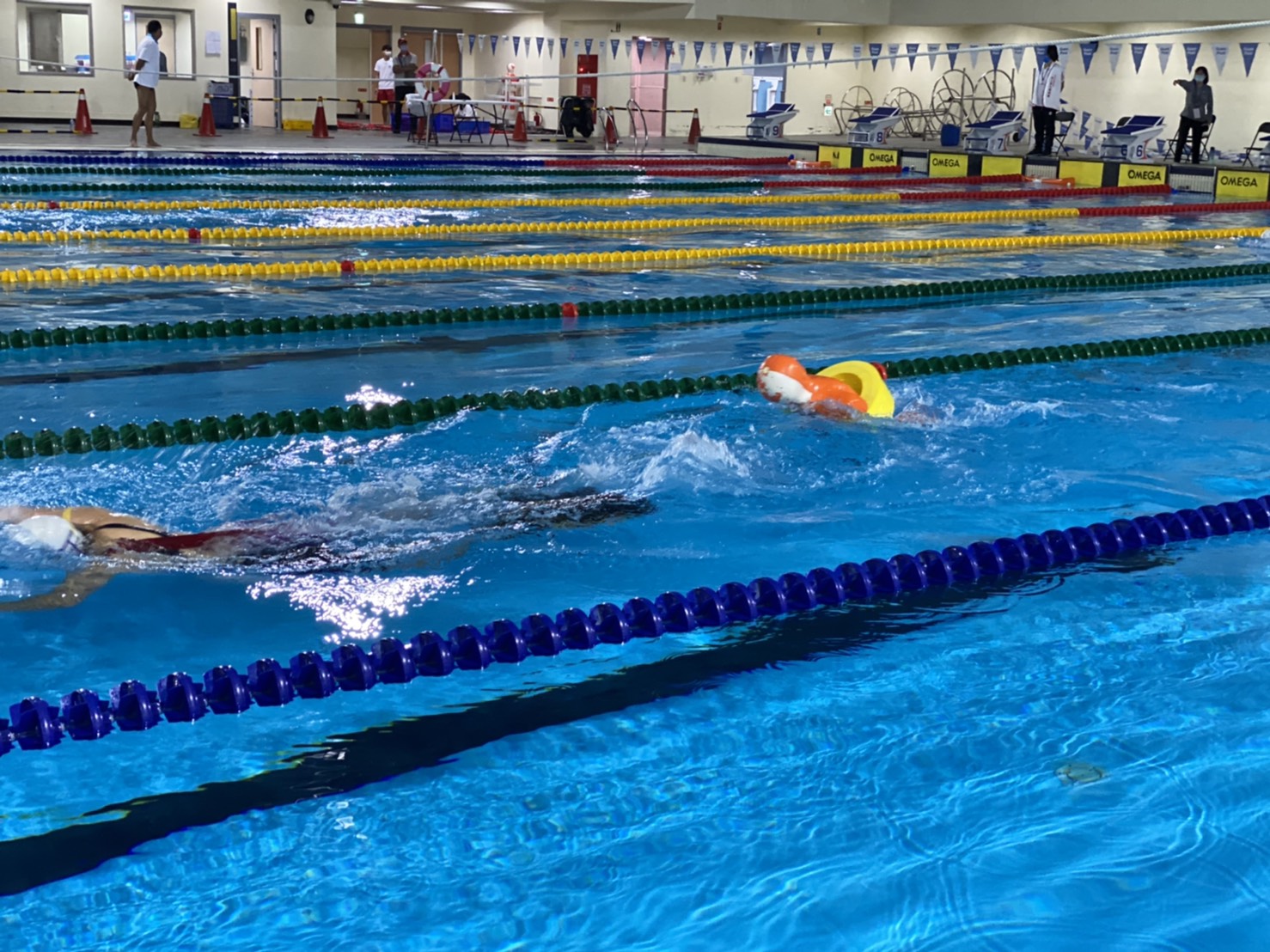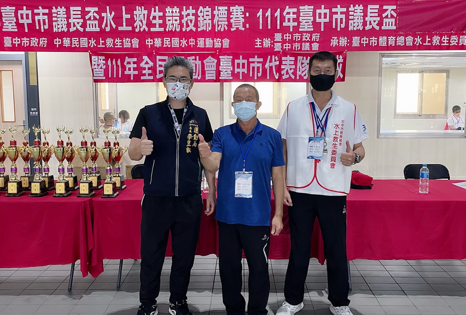 運動局說明,活動因應疫情,配合中央流行疫情指揮中心防疫規範,落實量體溫、酒精消毒等相關措施,除場上選手外,其餘人員須全程戴口罩,體溫超過37.5度者不得入場。今日賽事,運動局長李昱叡、中華民國水上救生協會理事長廖茂為、台中市體育總會水上救生委員會主委薛烱東等人均出席為選手加油打氣。(5/28*16)*運動局