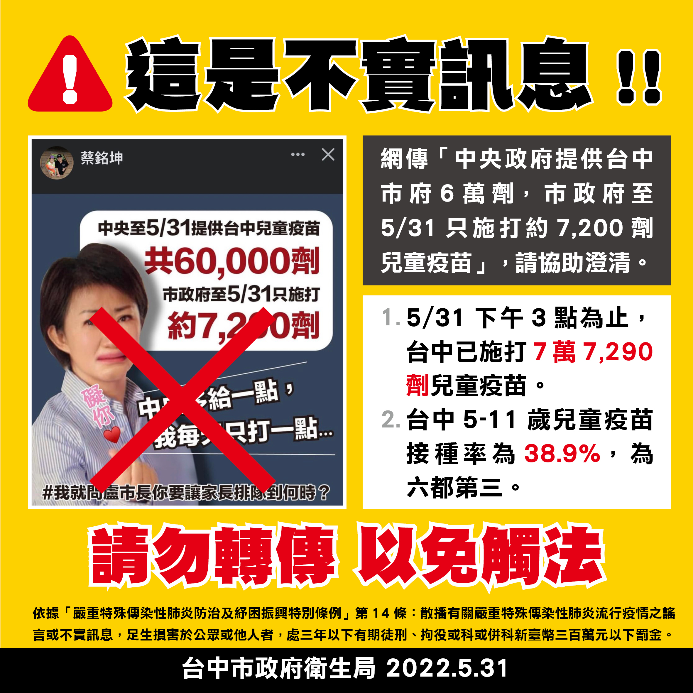 網訛傳中市兒童疫苗「只打一點」中市府駁斥提醒勿觸法