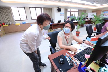 盧市長指出,因應政策昨日宣布,預計下週一啟動發放,她特別關心各個系統的快篩試劑整備情況,包括基層守望相助隊、公所臨櫃人員、里鄰長及調解委員等,這些人員都會透過區公所系統發放,因此今天特別到南屯公所視察,感謝公所人員與志工,在端午連假期間協助分裝快篩試劑,她也準備一些粽子給同仁,感謝同仁犧牲端午假期整備物資,祝福大家端午佳節闔家安康。