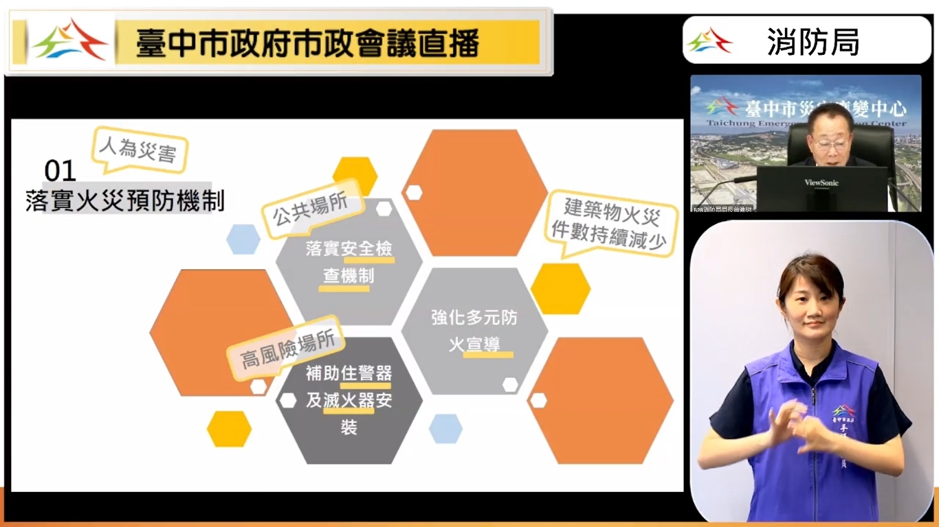 台中市為全國第二大城,落實火災預防機制、充實救災應變能量及提升緊急救護技能缺一不可。市長盧秀燕今(14)日主持線上市政會議表示,市府從三方面加強城市安全,包含人力、設備及宣導市民做好防護。台中市消防人力從107年1466人到今年1711人,共增245人,未來三年預計再增242人;今年編列消防設備預算更高達1億4,650萬元;而台中市住警器設置為六都第三。