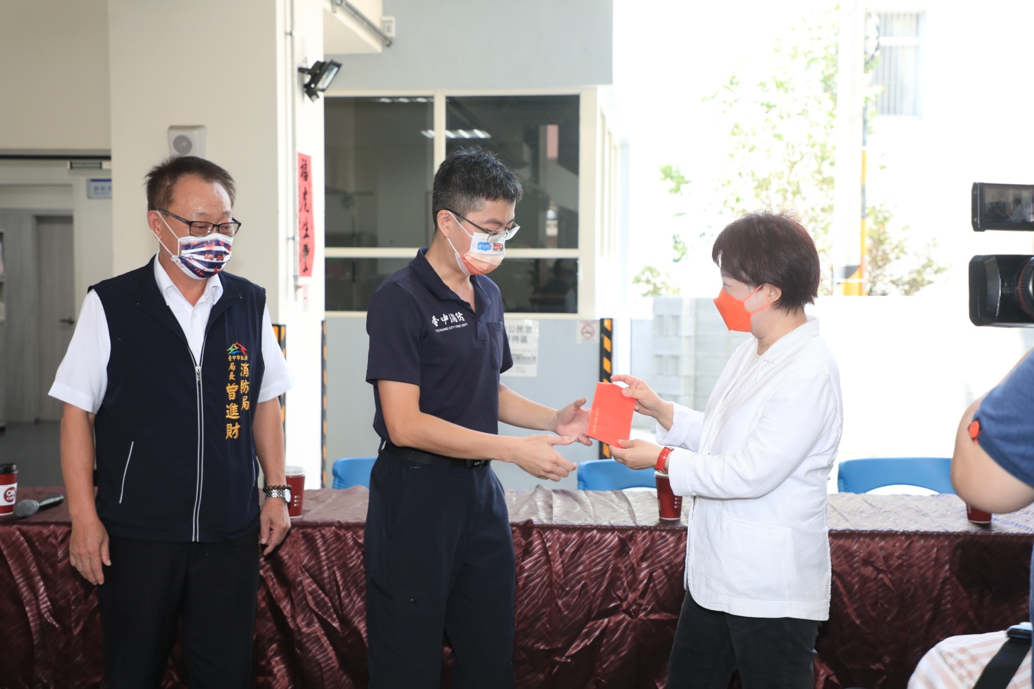 盧市長今日視察時發放加菜金1萬元及慰問品,慰勞過去一年來所有同仁的打拚與努力,義勇消防總隊第三大隊顧問團長陳炎生也響應市長,當場加碼捐贈20萬元,並請市長轉為發給太平消防分隊作為加菜金。