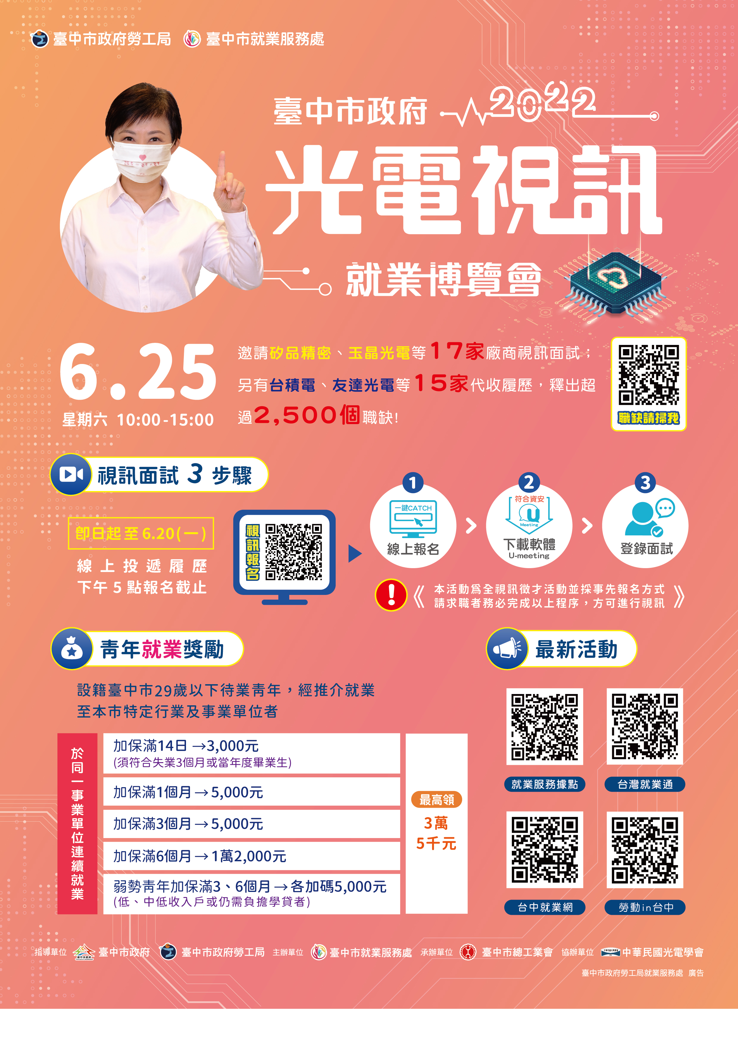 兼顧市民防疫及就業需求!台中市政府勞工局首創全國推動「全視訊」面試徵才,並針對應屆畢業生及求職者需求,於6月25日推出全線上「光電視訊就業博覽會」,邀請32家廠商面試,釋出2,500個職缺,即日起開放線上投遞履歷至6月20日下午5時止,盼藉遠端視訊技術,減少群聚感染風險,全力排除疫情造成的就業障礙,協助求職者接軌職場。
