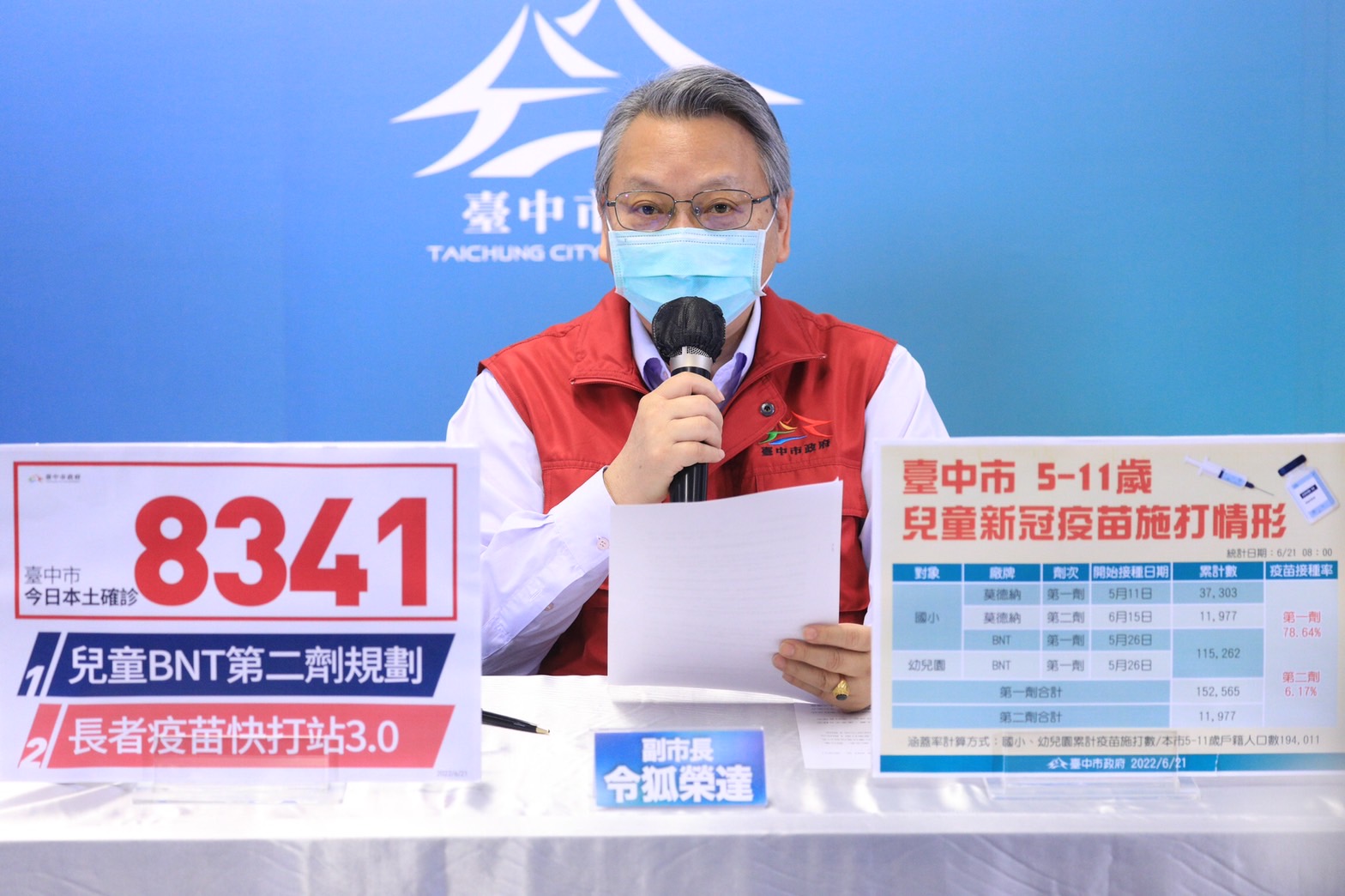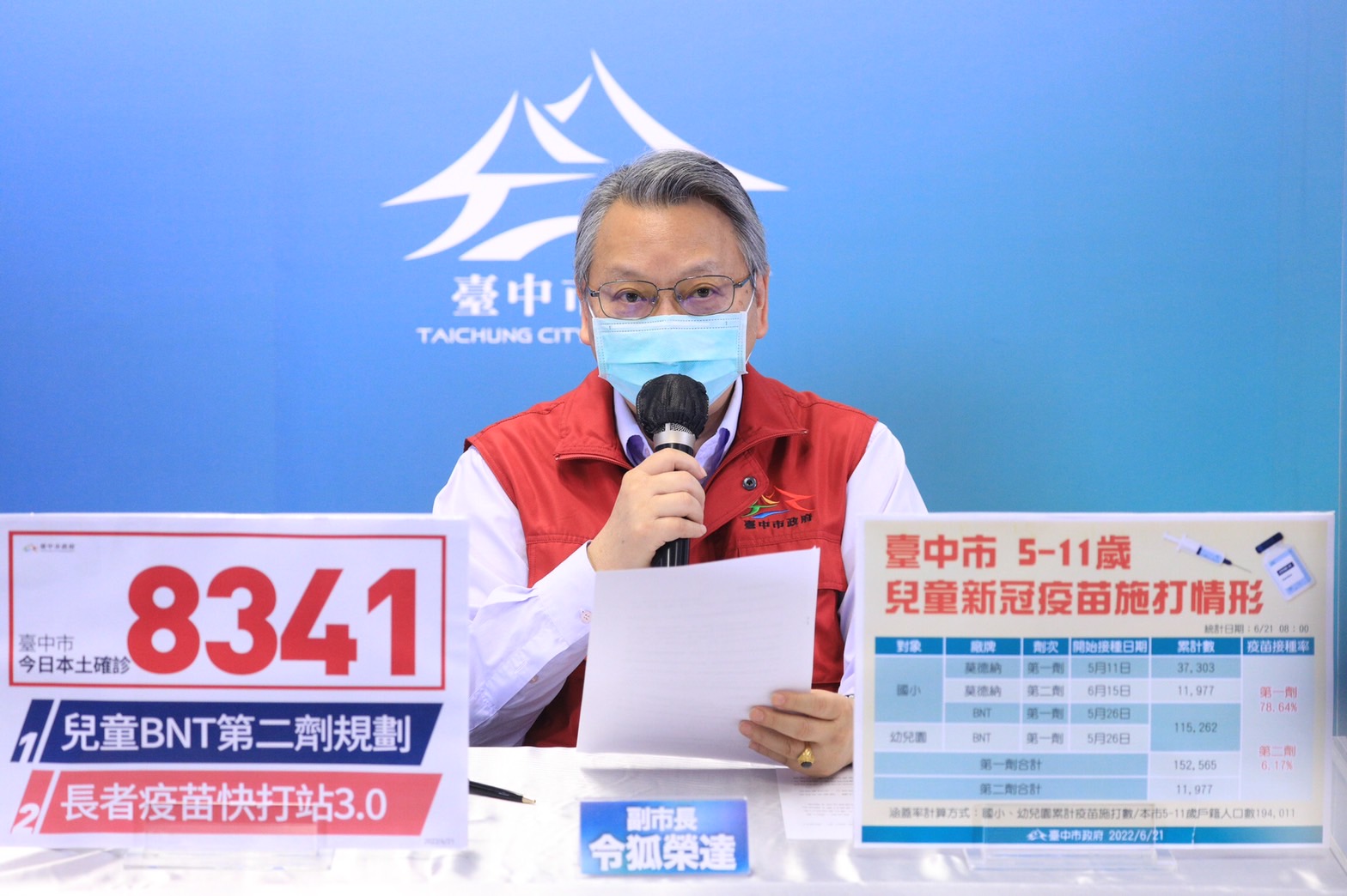 全國今(21)日新增本土確診5萬6,339例,台中市新增8,341例,其中7,930例為快篩陽確診,佔95.07%。副市長令狐榮達今日於疫情線上記者會表示,第二劑兒童BNT疫苗,教育局上周五已針對國小、幼兒園啟動施打意願調查,6月23日起,台中市將採取醫療院所、校園集中接種、假日校園快打站「三管齊下」開打,家長可選擇自己最方便的方式,讓孩子接種疫苗。