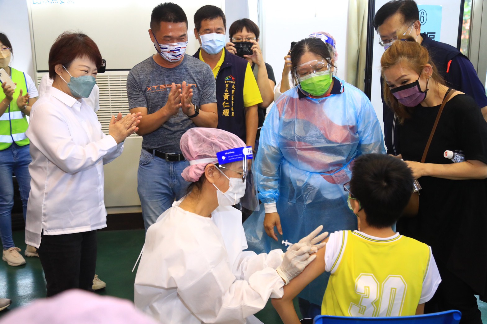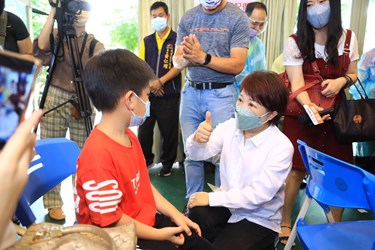 提升兒童防護力!台中市政府採醫療院所、校園集中接種、假日校園快打站「三管齊下」陸續開打第二劑兒童BNT疫苗,今(25)日開設12處校園快打站為孩子接種。台中市長盧秀燕一早前往大里瑞城國小關心快打站接種情形,並慰勉工作人員辛勞。