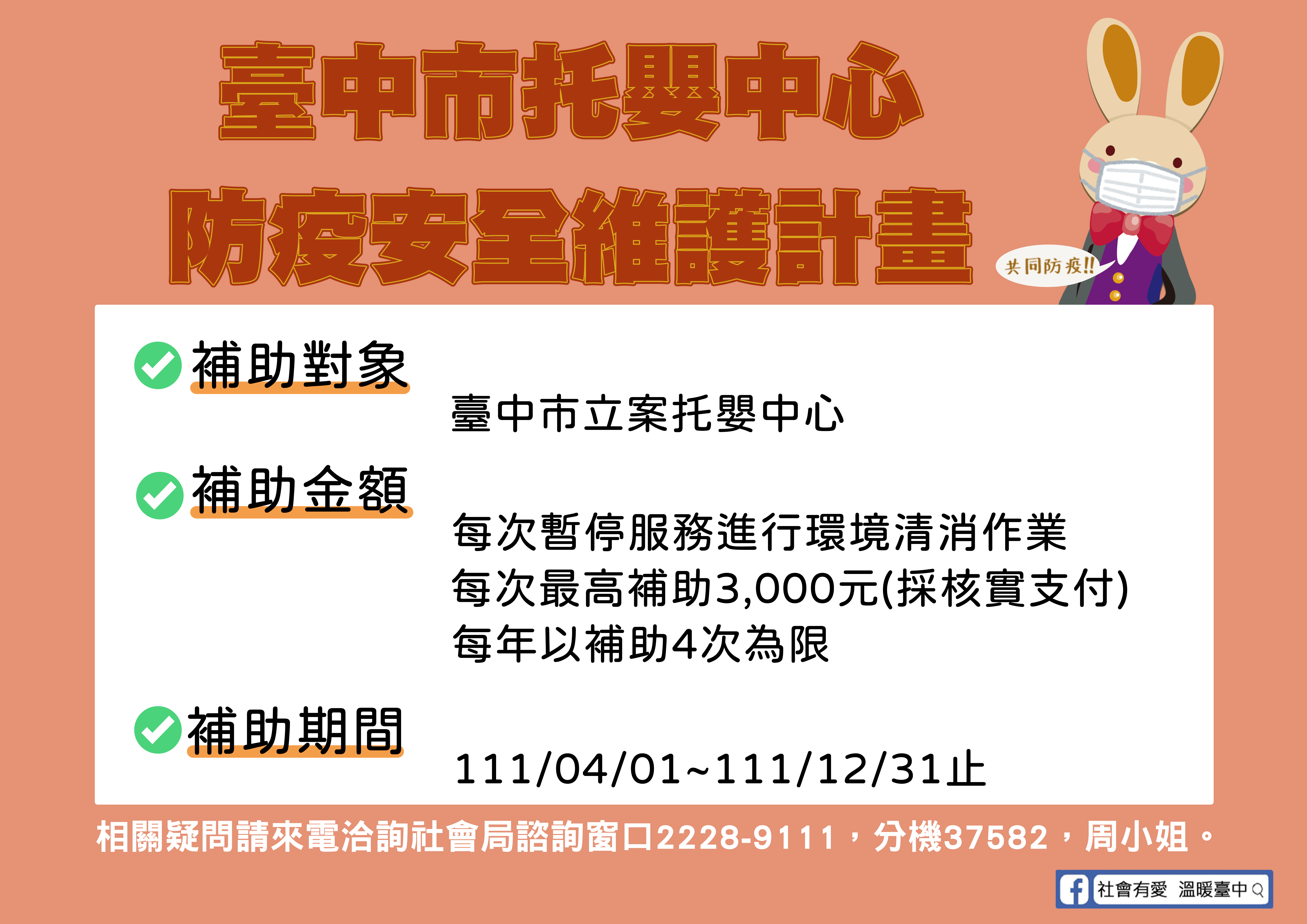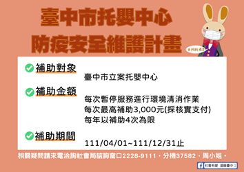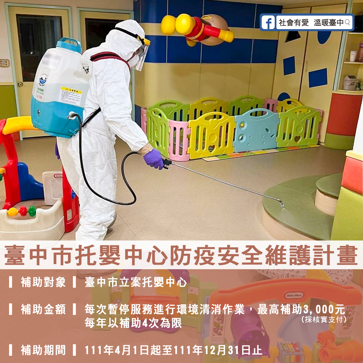 今年4月起,台中市托嬰中心陸續通報確診案例,台中市政府社會局表示,為守護嬰幼兒健康,若托嬰中心因出現確診案例需要環境清潔消毒,市府每次最高補助清消費3,000元,最多1年補助4次,確保托嬰中心托育環境安全。今年12月31日前,托嬰中心可檢附清消相關證明文件及支出憑證,向社會局申請。