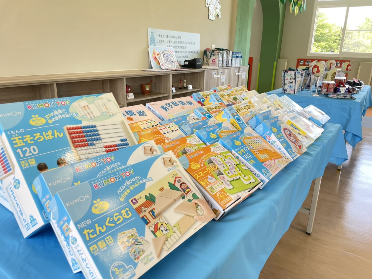 此外,台灣孔孟文化事業有限公司、財團法人台北市蔡雪泥公益慈善基金會和財團法人功文文教基金會,合贈一批KUMON教玩具,包含益智拼圖、七巧板、中英文字卡、中英文童謠CD等,總價值30萬元,將分送給18間親子館和公托,啟發幼兒多元智能。