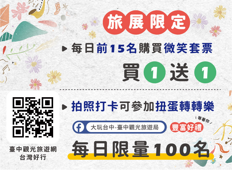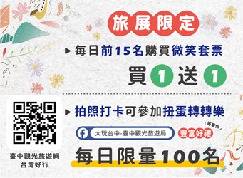 觀旅局指出,現場更祭出「台灣好行台中時尚城中城線」童趣玩樂的旅優惠套票,每日前15名加碼買11,購買套票還可參加扭蛋轉轉樂活動,有機會獲得限量時尚小黃傘及精美小禮物。另也規劃1元競標、限時搶購、大玩台中Line OA互動促銷等好禮抽獎活動,同時精心安排「大玩台中」轉轉樂遊戲,只要到台中館參與活動,限量版口罩及精美紀念品通通帶回家。