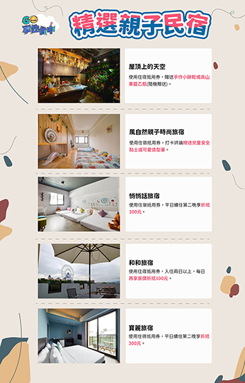 此外,台中福華大飯店推出超優惠價格的「FUN 暑假」及「科博探險趣」住房專案,「FUN 暑假」專案平日2人成行2,799元起,加贈200元抵用券、「科博探險趣住房專案」4人成行4,688元起加送國立自然科學博物館門票;台中長榮桂冠酒店住房送德國知名Hape玩具,學生再享長榮咖啡廳自助百匯8折優惠,而平日使用悠遊國旅補助入住久窩行旅雅致客房,享免費升等成豪華客房;背包41青年旅館,住房加碼贈送限量精美小禮物;想窩11餐旅館住宿享用午晚餐再贈哈根達斯冰淇淋。
