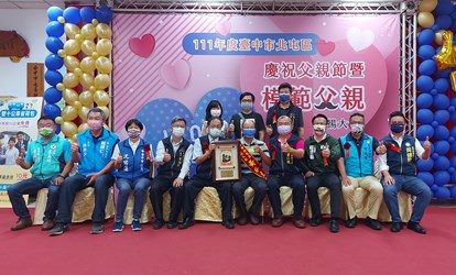 台中市北屯區公所今(31)日舉辦「111年度模範父親表揚活動」,邀請區內受表揚的52位模範父親一起提前慶祝父親節。台中市政府民政局長吳世瑋代表市長盧秀燕頒贈「良父典範」獎牌,並獻上最真摯的感謝與祝福,預祝所有爸爸們父親節快樂,家庭美滿幸福。