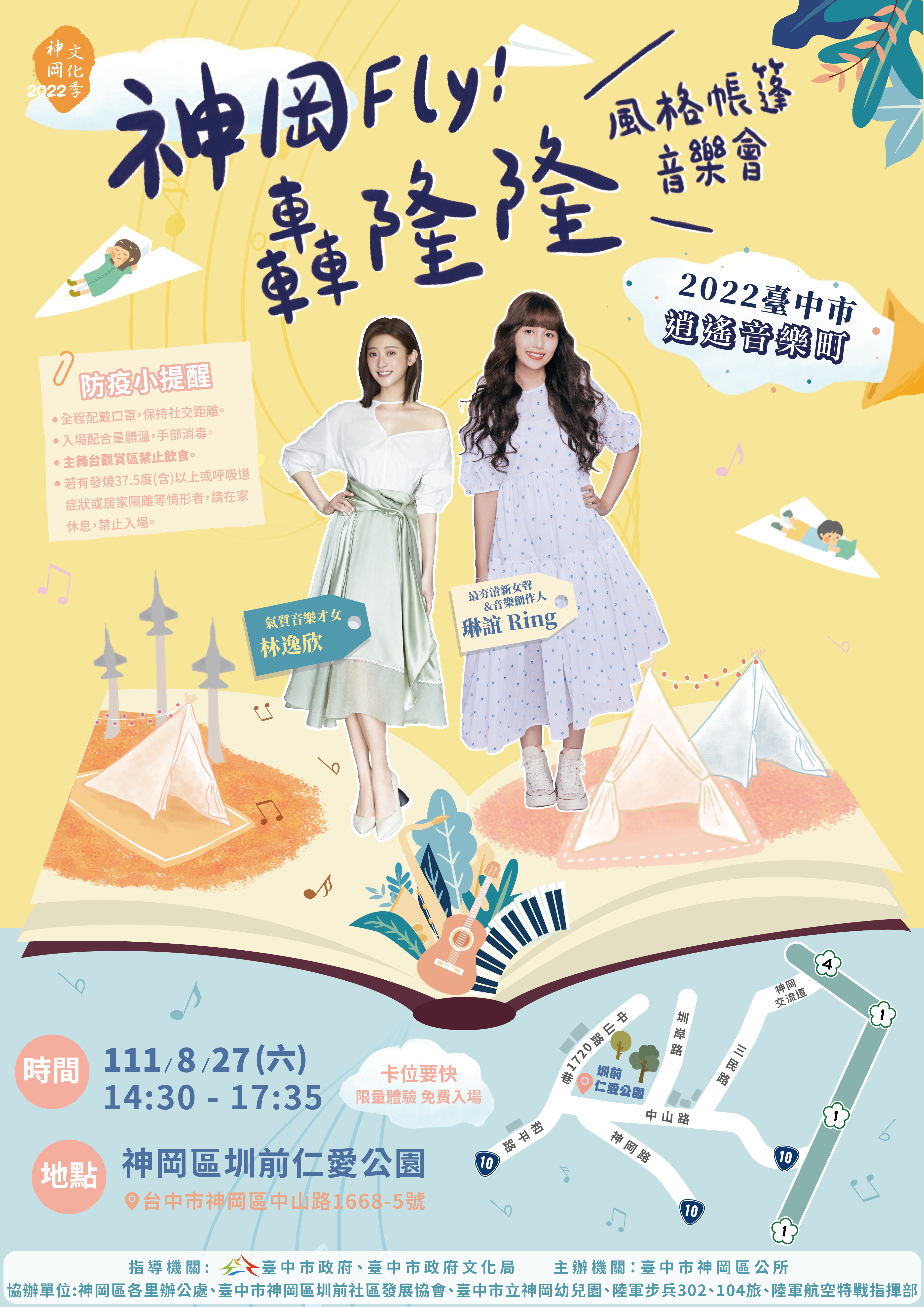 此外,「神岡Fly!轟隆隆 風格帳篷音樂會」則在26日下午2時於神岡圳前仁愛公園舉辦,邀請樂迷輕鬆席地,坐在遼闊天際、樹蔭環繞下,欣賞清新女聲「琳誼」、音樂才女「林逸欣」雙姝帶來美聲演唱,還有神岡幼兒園律動、神岡國小口琴隊、社區長青鏗鏘有力的太鼓、神岡囝仔奏者樂團等表演節目,享受戶外音樂會帶來的舒暢感受;現場民眾也可體驗童趣跳格子、空拍機操控、彩繪木飛機,和神岡fly風格帳篷拍照打卡,上傳還可換限量好禮!