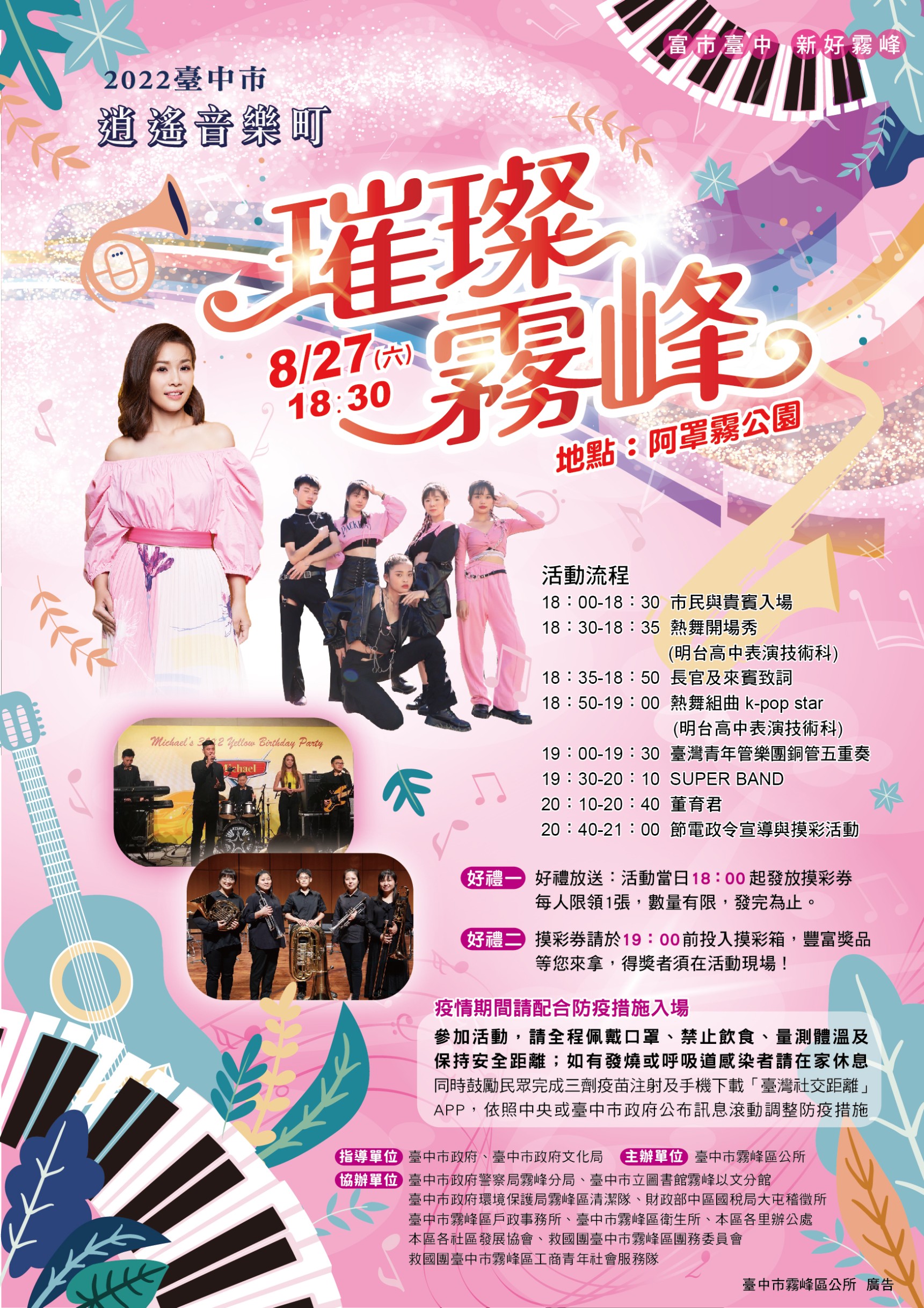 「璀璨霧峰」也在26日晚上6時30分阿罩霧公園閃亮登場,邀請「明台高中」表演技術科K-pop熱舞組曲演出,並由台灣青年管樂團銅管五重奏帶來多首膾炙人口的樂曲,最後由知名歌手董育君壓軸獻唱,歡迎民眾在週末假期漫遊走讀霧峰夜晚,一同聽好歌、看熱舞,透過動人弦律及美妙舞姿,一起走進璀璨音樂隧道及舞藝饗宴。