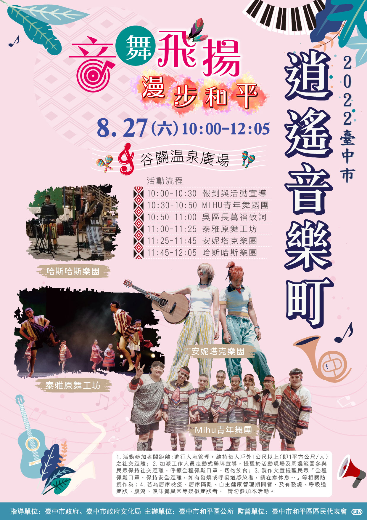 接著,26日還有3場各具特色的音樂會,首場於上午10時在和平區谷關溫泉廣場辦理「音舞飛揚.漫步和平音樂會」,由原鄉表演團體泰雅原舞工坊、MIHU青年舞蹈團、哈斯哈斯樂團帶來泰雅傳統歌舞演出,知名台中市街頭藝人團體安妮塔克樂團也將以木吉他、木箱鼓的純粹組合帶來動人心弦表演。