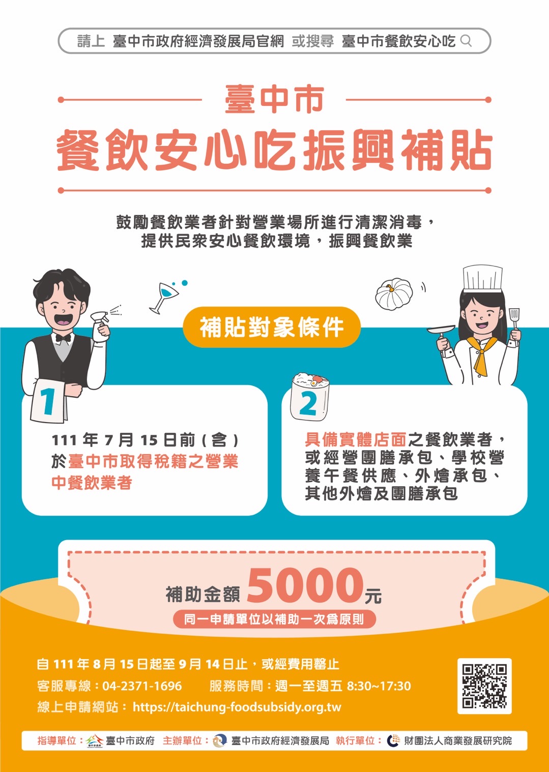 相關訊息可上「臺中市政府經濟發展局」官網( https://www.economic.taichung.gov.tw/16103/16153/16163/16217/2133338/2133543/post )或上網搜尋「臺中餐飲安心吃」( https://taichung-foodsubsidy.org.tw ),有明確申請方式、步驟及注意事項,為使業者快速了解,也備有懶人包、教學影片及相關問答等,另提供專線電話於上班時間供諮詢04-23711696(周一至周五早上8:30至下午5:30),歡迎大家踴躍申請。(9/1*13)*經濟發展局