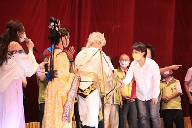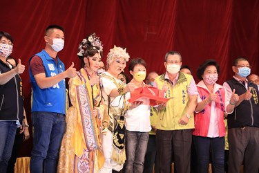 台中市政府文化局今(1)晚邀請明華園日字戲劇團,在大里草湖太子宮演出經典大戲《八仙傳奇》,疫情趨緩之際各項藝文活動也陸續恢復舉辦,在人文薈萃的台中市更是強檔一波接一波,希望所有的市民朋友都能做好自我防護,走出戶外,享受豐富的藝文饗宴。市長盧秀燕也出席與市民朋友一同重溫廟口看戲的懷舊時光。