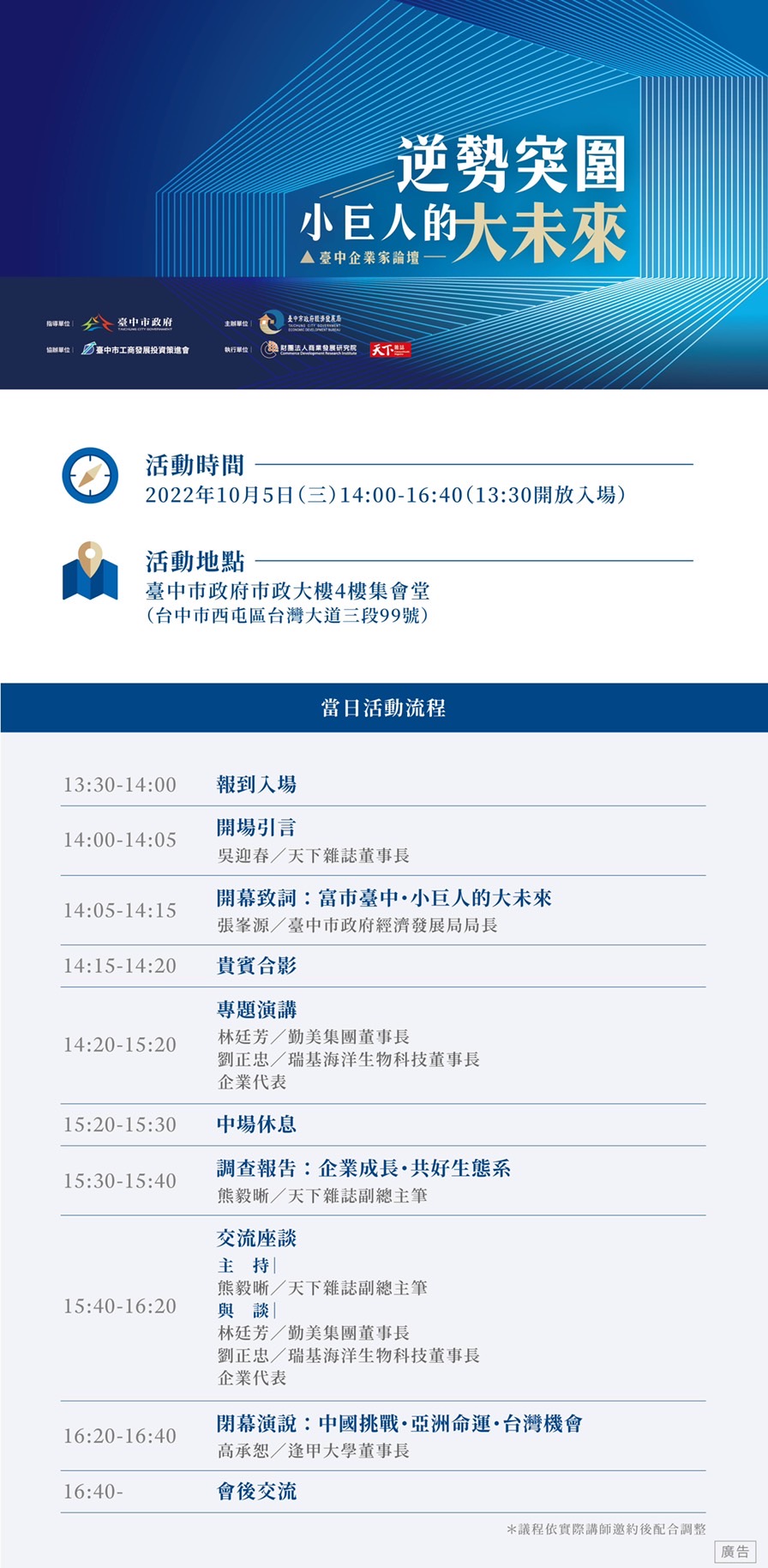 面臨國際情勢、景氣、通膨及升息等因素,抵禦市場不確定因素並保持競爭力是每個企業的重要課題。台中市政府經濟發展局攜手天下雜誌,105日下午2時至5時將於台中市政府台灣大道市政大樓4樓集會堂舉辦「台中企業家論壇-小巨人的大未來」,邀請多位經貿界代表分享經驗,歡迎大家參加,共同探討企業成長轉型契機。