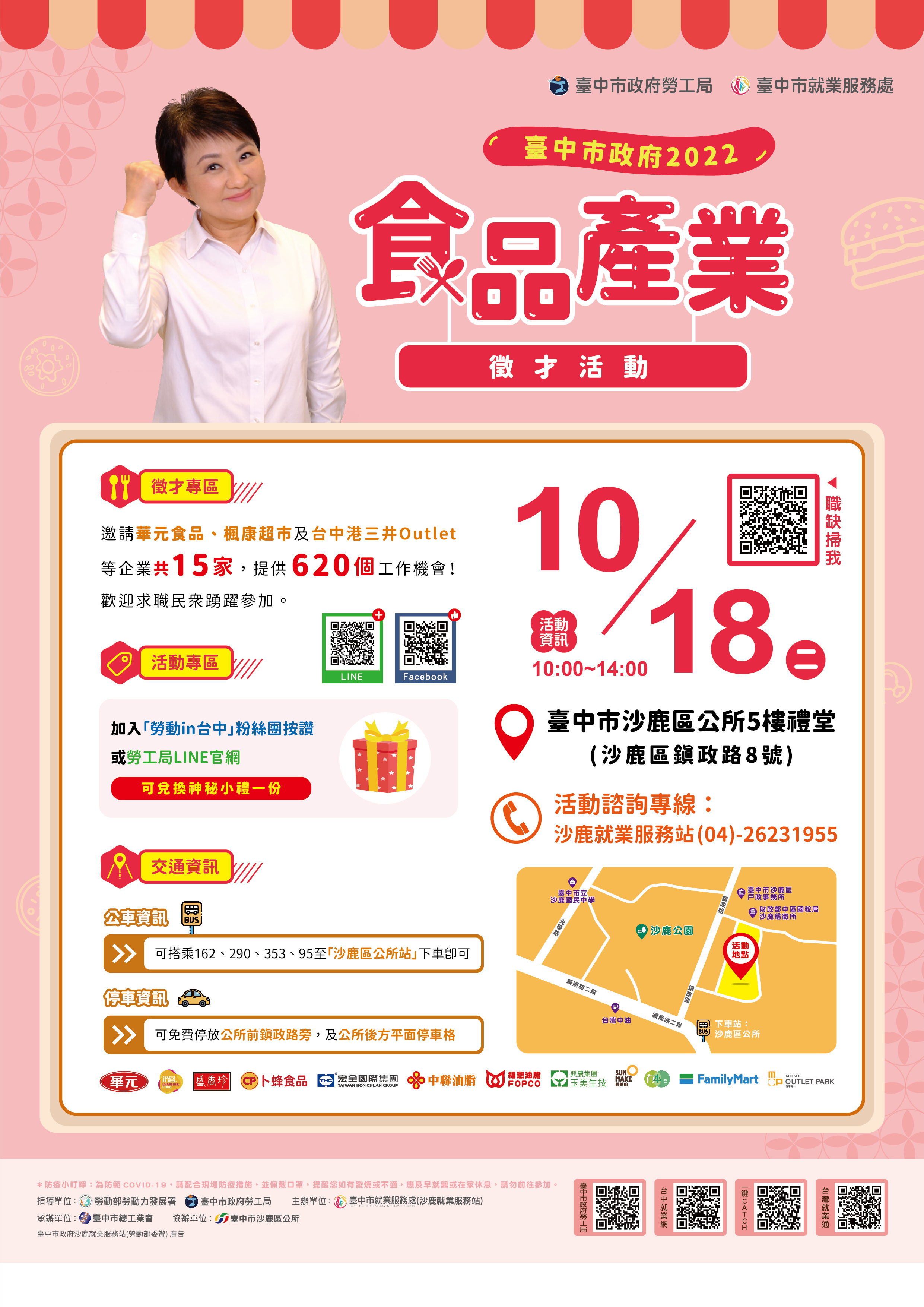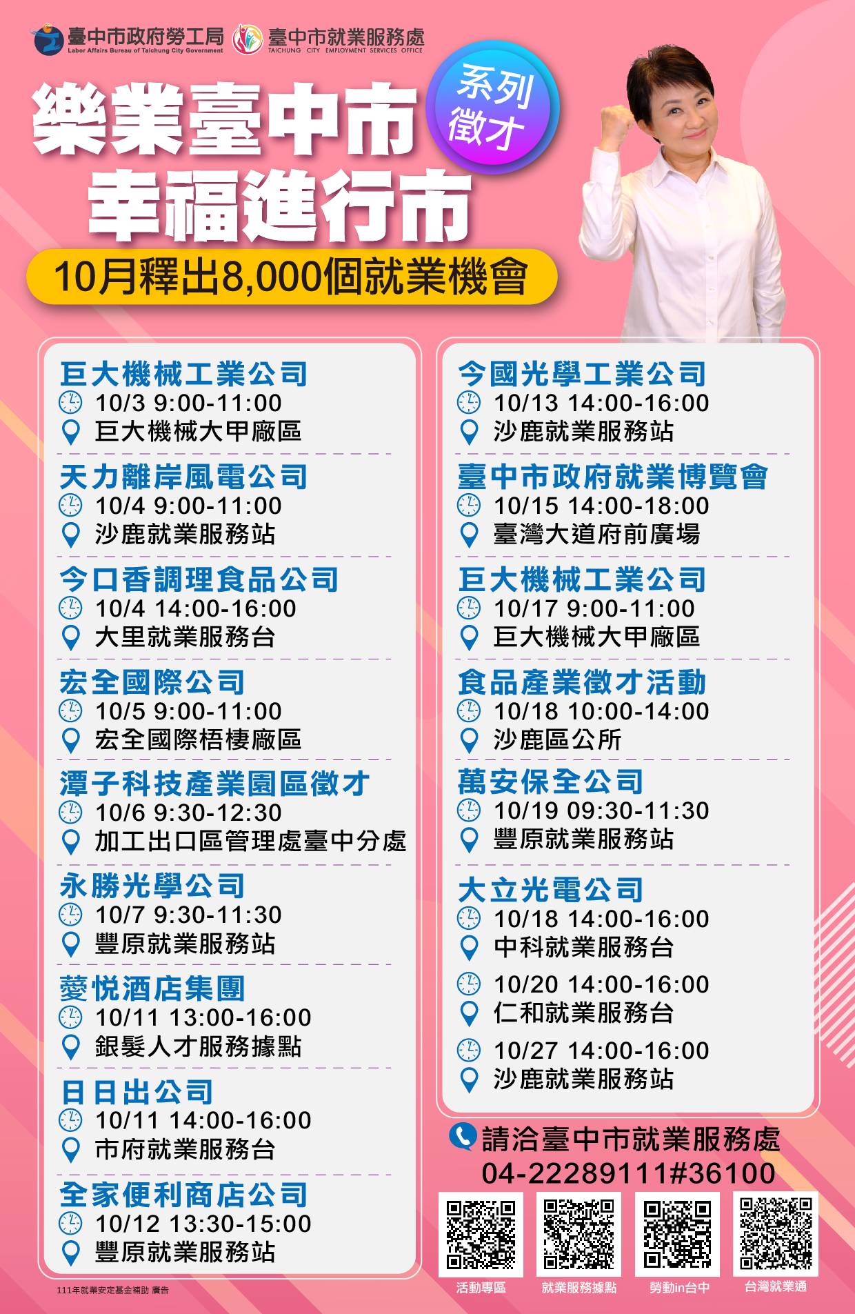 台中市就業服務處補充,這次「樂業台中市 幸福進行市」系列徵才活動,包含10月15日台灣大道市政大樓前廣場舉辦「台中市政府就業博覽會」,邀集玉晶光電、大立光、輕井澤等知名企業,釋出6,500個職缺;10月18日也預計在沙鹿區公所5樓禮堂辦理「食品產業徵才活動」,邀集宏全國際、台灣卜蜂、雲雀國際、洽富實業等15家食品大廠共襄盛舉,釋出620個工作機會。更多資訊歡迎至台中市就業服務處活動專區(https://www.eso.taichung.gov.tw/834066/Lpsimplelist )查詢,或電洽04-22289111分機36100洽詢。(10/8*8)*勞工局