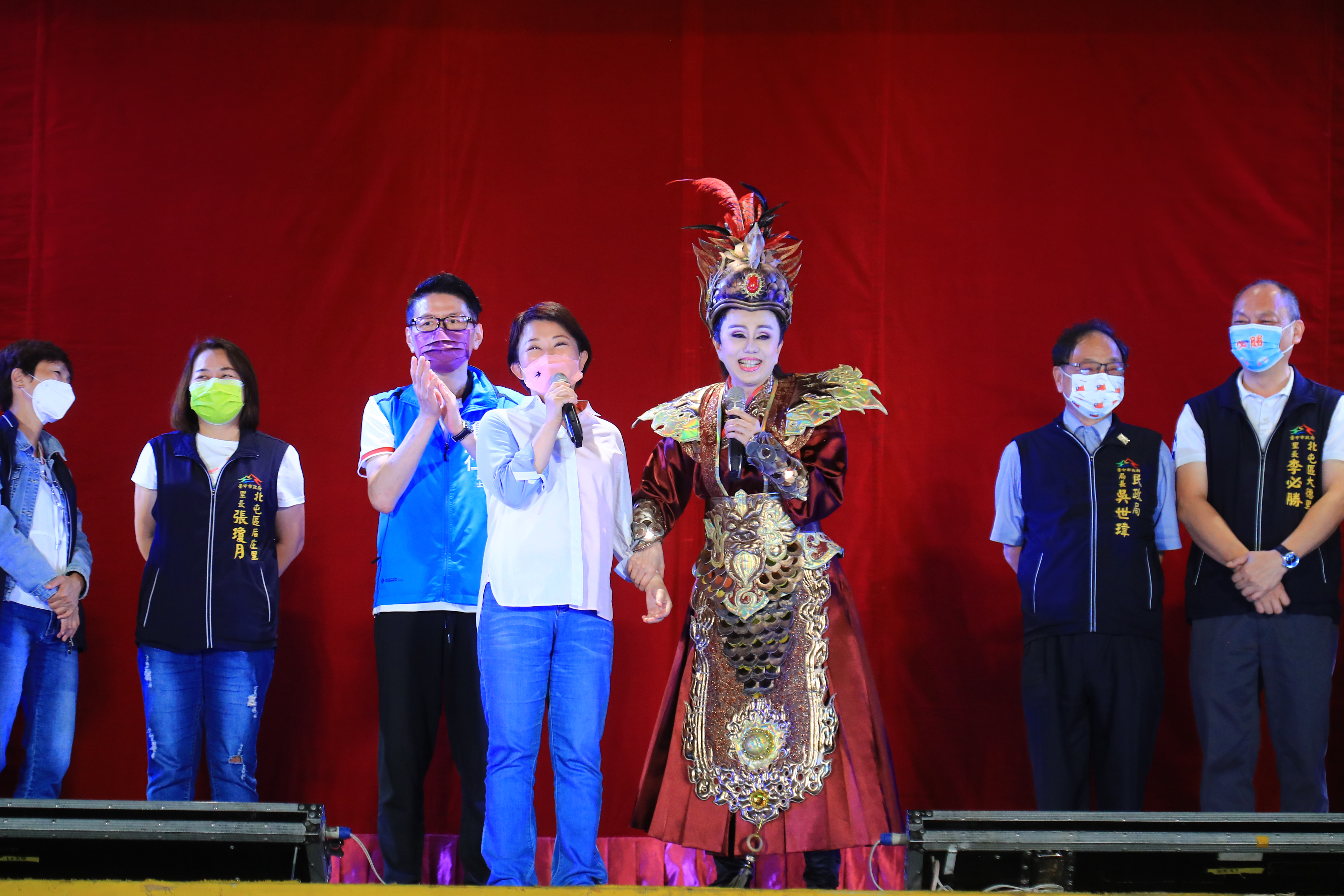 盧市長並指出,台中市政府非常支持藝文活動,隨著疫情逐漸解封,安排一系列戲劇活動,讓深受疫情影響的藝文團體有演出機會,也讓市民走出家門欣賞藝文表演。今晚特別由明華園當家小生孫翠鳳本人領銜,也是孫老師第一次演出反派的戲碼,以這場大戲獻給北屯鄉親,祝福所有民眾有個美好的夜晚。
