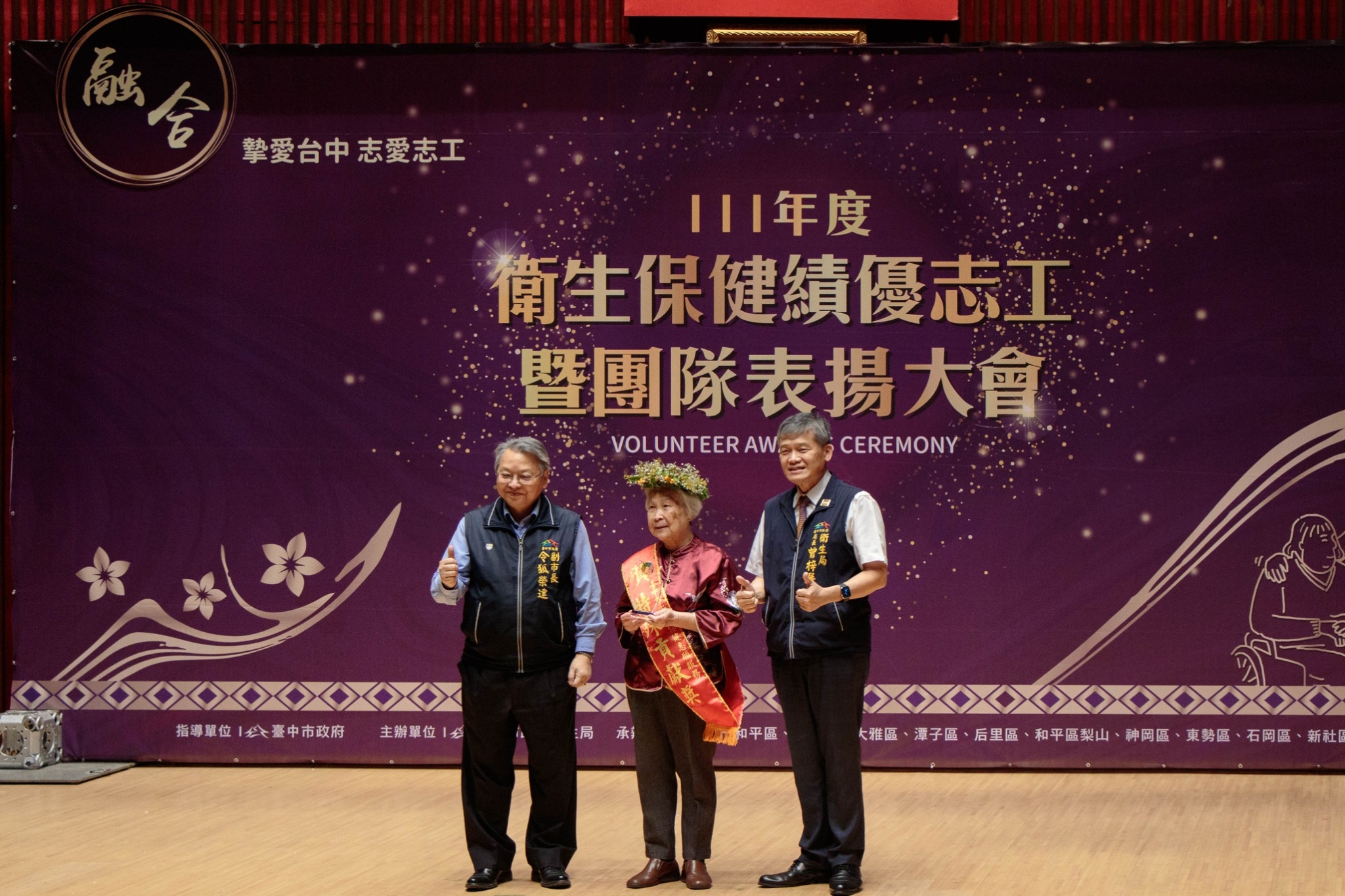 令狐副市長說明,台中市有87個衛生保健志工隊,志工人數逾6千人,今天共有89位志工受表揚,其中特殊貢獻獎得主朱菊蘭志工已擔任志工19年,服務時間超過1萬小時,令人敬佩;另還有松馨獎15名,服務年資滿5年,時數達1000小時以上;梅馨獎26名,服務年資3年以上,時數達600小時以上;蘭馨獎47名,服務滿1年,時數達300小時以上,長期參與志工非常不容易。