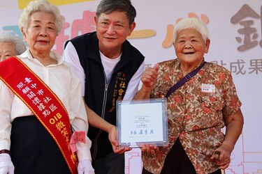今日由據點票選的「Old is Beautiful3位微笑大使擔任頒獎大使遞送獎牌,社會局長彭懷真一一頒獎,感謝長輩們發揮以老助老的精神,彰顯高齡志工在據點服務更有意義。彭局長表示,此次共有1290歲以上的長者獲頒長青模範生獎,今年特別設立模範夫妻志工獎,鼓勵夫妻檔一起響應當志工,因為志工是撐起據點服務的重要基石,歡迎志工全家一起投入服務。