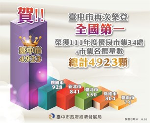經濟部公布今年優良市集及樂活名攤評核成績,這項評核向來有「菜市場金馬獎」美名,台中市傳統市集這次摘星數達4,923 顆,較上次進步1,032顆。台中市政府經濟發展局長張峯源表示,市長盧秀燕上任後持續深耕市場經營,重視軟硬體改善,獲攤商肯定,此次評核在市府與攤商齊心協力下,締造「全台唯一突破4千顆星門檻」,連3年獲得全國總星數第一名,締造史無前例的三連霸紀錄。