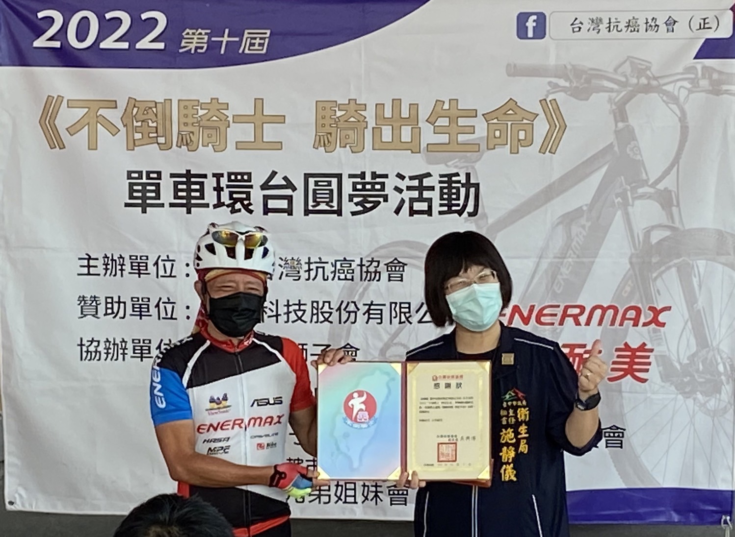 今日台灣抗癌協會長吳清傳致贈感謝狀給衛生局,呼籲市民落實定期篩檢、養成良好生活型態。衛生局長曾梓展指出,「不倒騎士團」自民國100年起,號召癌友以「騎出生命」的精神,展現生命的活力及逆風飛翔的態度;其中罹患大腸癌的張先生分享,過去疏忽定期篩檢,直到身體發出警訊才至醫院接受身體健康檢查,發現罹患大腸直腸癌第三期,歷經多次化療之苦,戒掉50年的菸酒習慣,培養健康飲食及運動的習慣,並開始參與單車環台的運動。