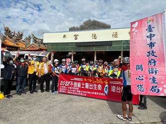 台灣抗癌協會第10屆「不倒騎士 騎出生命」單車環台圓夢之旅,抗癌勇士今(7)日抵達台中市政府衛生局附近的豐原福德宮,衛生局團隊熱情迎接參與環台的各地抗癌鬥士們。衛生局表示,不倒騎士(癌友)們揮別罹癌陰霾,走出戶外,完成自行車環台挑戰,證明快樂積極的心是對抗病魔的最佳解藥,盼透過此次活動,提醒市民規律運動及定期癌症篩檢的重要性。