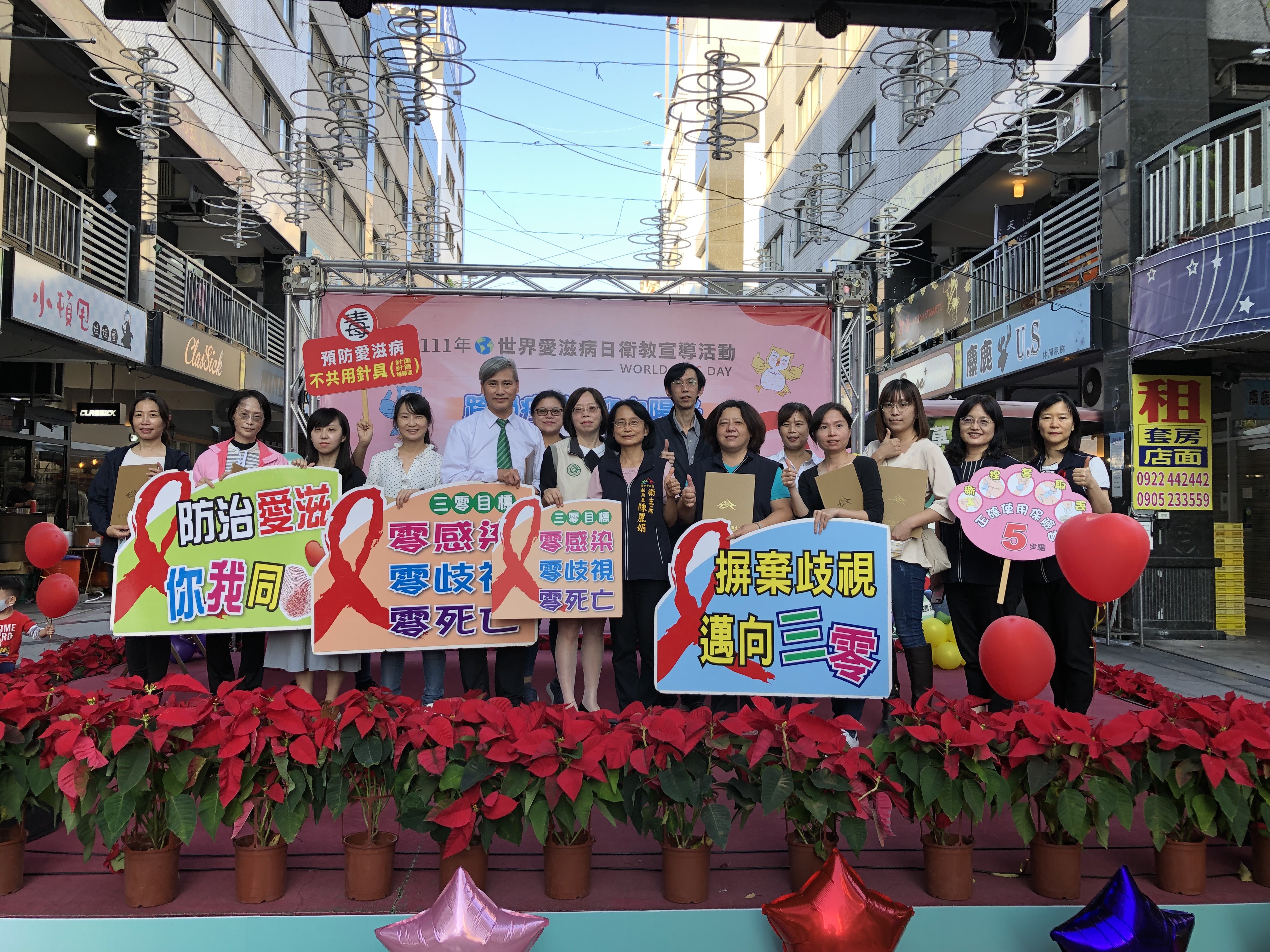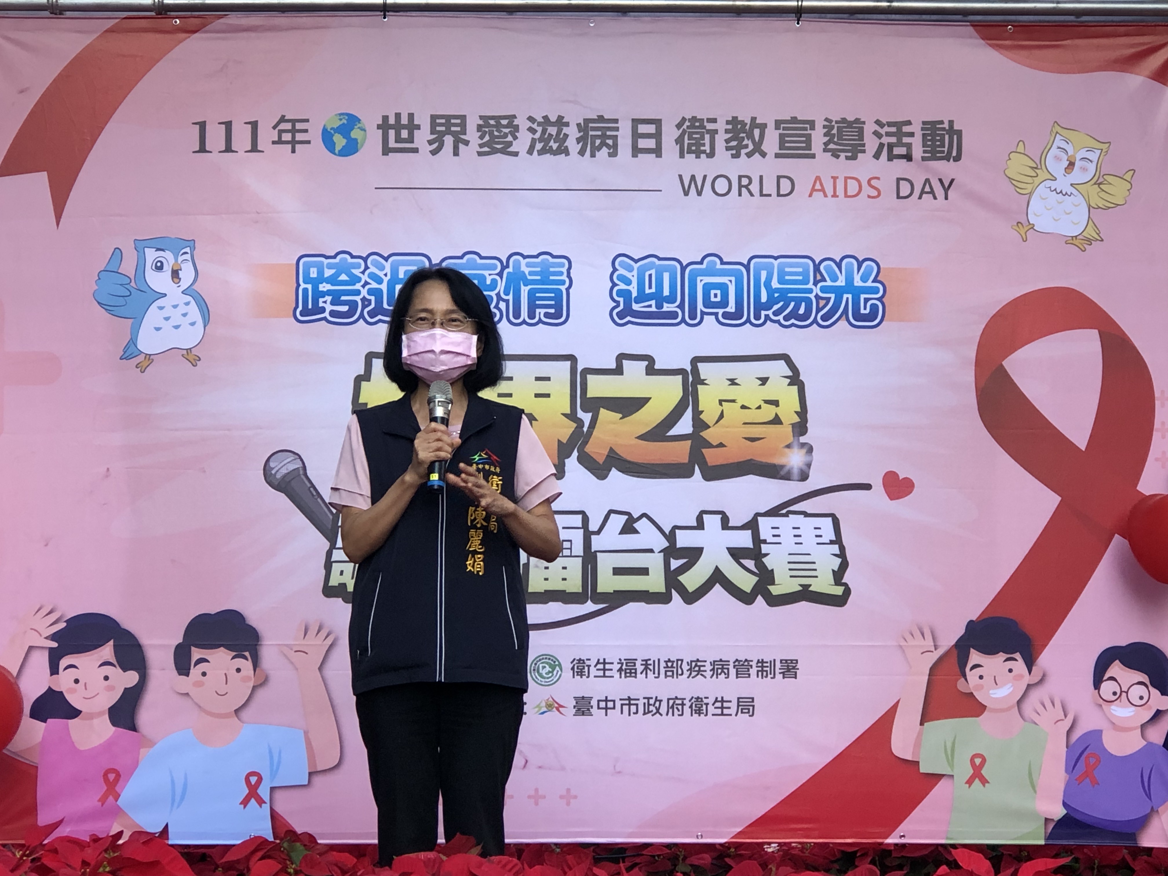 12月1日為世界愛滋病日,台中市政府衛生局今(3)日在一中益民商圈舉辦世界愛滋病日衛教宣導活動,以「跨過疫情迎向陽光」為主題,辦理歌曲競賽活動,推廣安全性行為,吸引約500人共同響應。副局長陳麗娟表示,市府遵循世界衛生組織(WHO)95-95-95策略,希望達到95%的感染者藉由篩檢知道病況、95%知道病況者能按時服用藥物,以及95%的服藥者病毒量能成功被抑制,也呼籲民眾尊重並關懷愛滋病患,消除歧視。