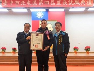 台中市北屯區公所今(25)日舉辦北屯區第四屆里長就職典禮,其中37位里長連任成功,另平興里長黃彰國、民德里長江承鴻、松竹里長簡禎緯、北興里長廖玉森及舊社里長謝秉憲等5位為此屆新任里長,42位里長齊聚一堂,由民政局長吳世瑋及北屯區長歐陽明共同頒發當選證書。吳局長表示,恭喜42位里長順利當選,期許各位里長發揮視民如親的精神,共同打造幸福美好新北屯。