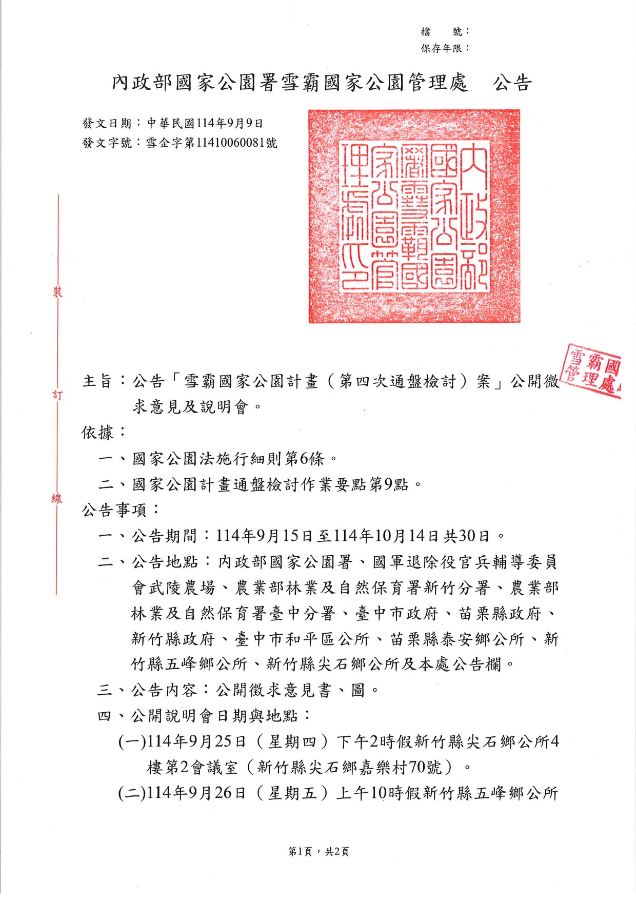 11136_2雪霸國家公園計畫-1 公告「雪霸國家公園計畫(第四次通盤檢討)案」,自114年9月15日起公開徵求意見30日及辦理公開說明會,相關公開徵求意見資料,得於內政部國家公園署雪霸國家公園管理處網站(https://www.spnp.gov.tw雪霸動態-最新消息)參閱。