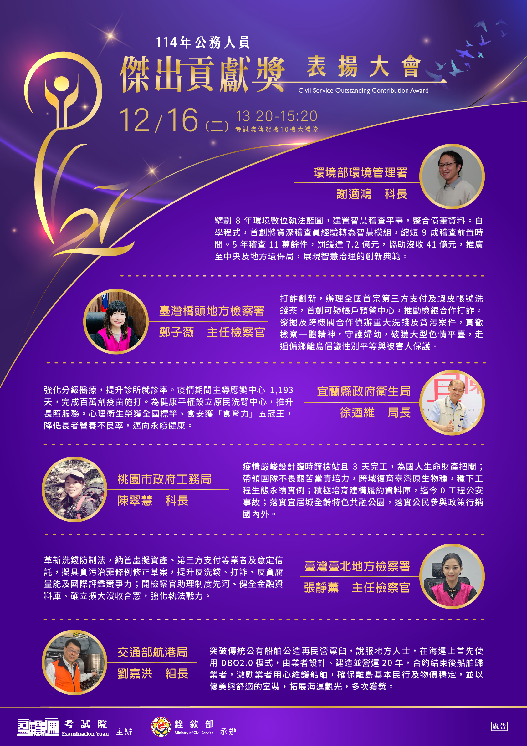 114年公務人員傑出貢獻獎業經考試院組成評審委員會評選出6名得獎人及6組得獎團體。