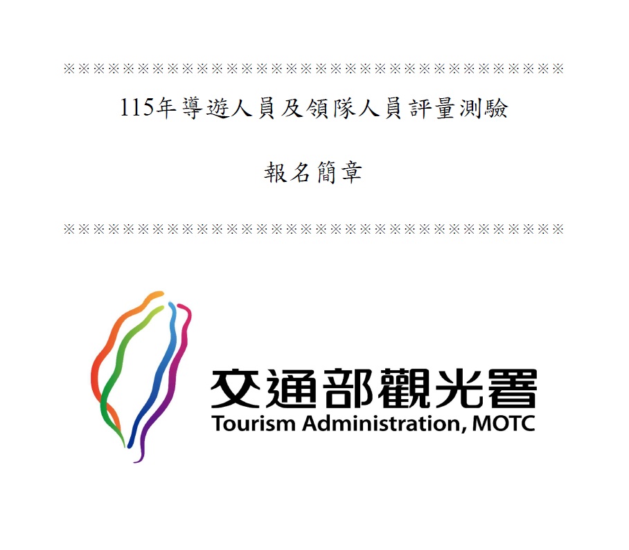 簡章 交通部觀光署訊息:115年交通部觀光署導遊人員及領隊人員評量測驗,自114年12月9日10時起至18日17時止受理網路報名,請有意參加評量測驗之民眾請至交通部觀光署導遊人員及領隊人員評量測驗網路報名資訊系統報名。