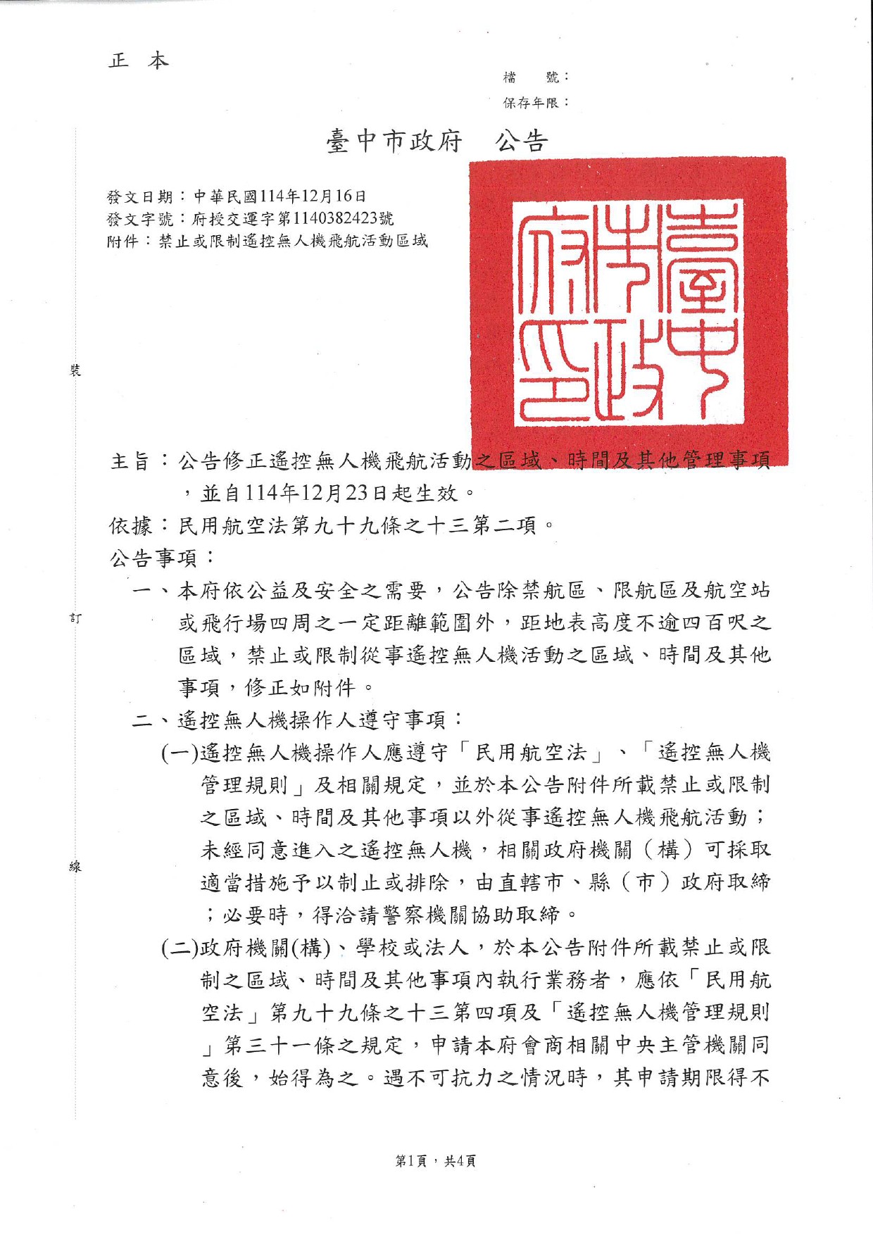【公告】本市修正「遙控無人機飛航活動之區域、時間及其他管理事項」