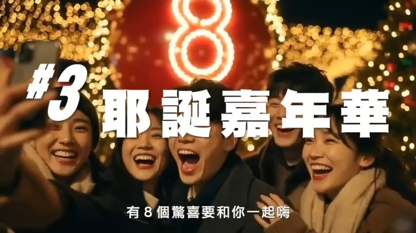hi 8宣傳影片 (17) 今年冬天,台中不只一場活動, 而是 88 天不間斷的城市派對。 「台中 Hi 8 全城開趴」串聯 8 大指標活動, 從耶誕嘉年華、最強跨年夜、重量級演唱會, 到中台灣燈會,讓整座城市一路升溫。 城市光影、幸運「8」字、音樂與歡笑齊聚, 邀請你來台中,過一個熱鬧又幸福的好年。