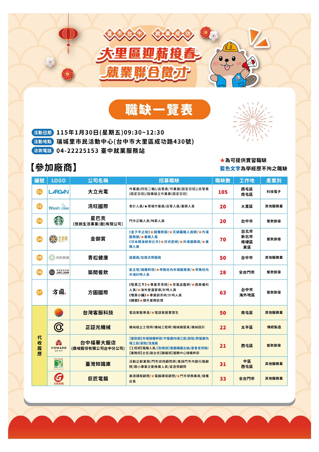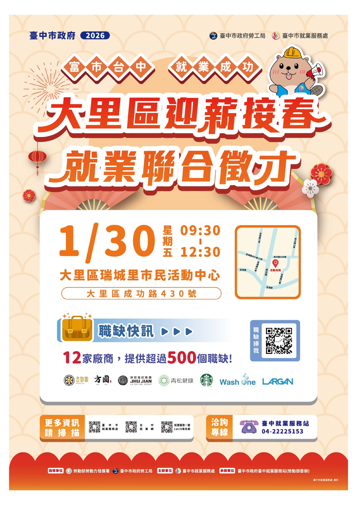 臺中市政府1月30日上午9:30至12:30,在大里瑞城里市民活動中心舉辦2026「富市台中 就業成功」大里區迎薪接春就業聯合徵才,邀請星巴克、大立光電、築間餐飲等12家廠商徵才,提供超過500個工作機會,洽詢電話04-22225153。