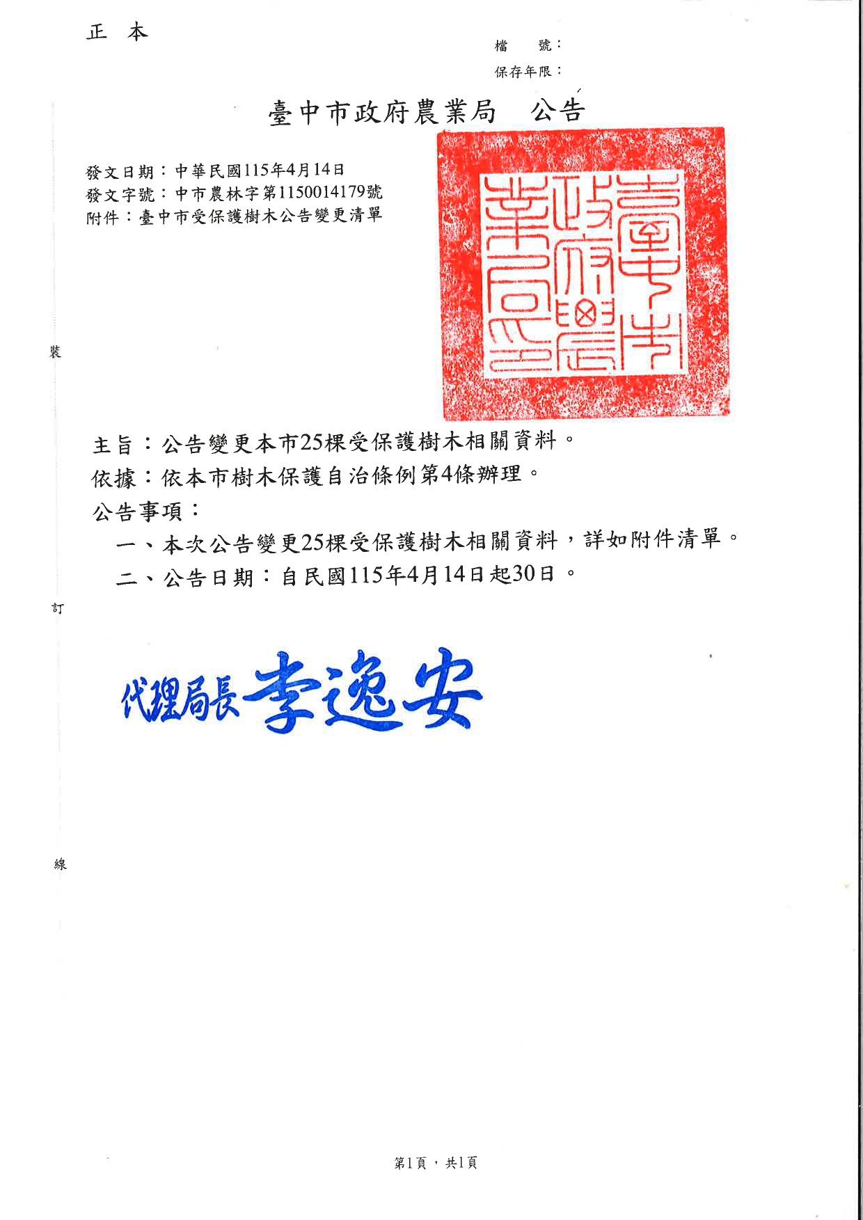 115年4月14日中市農林字第1150014179號公告受保護樹木資料,請參考附件。