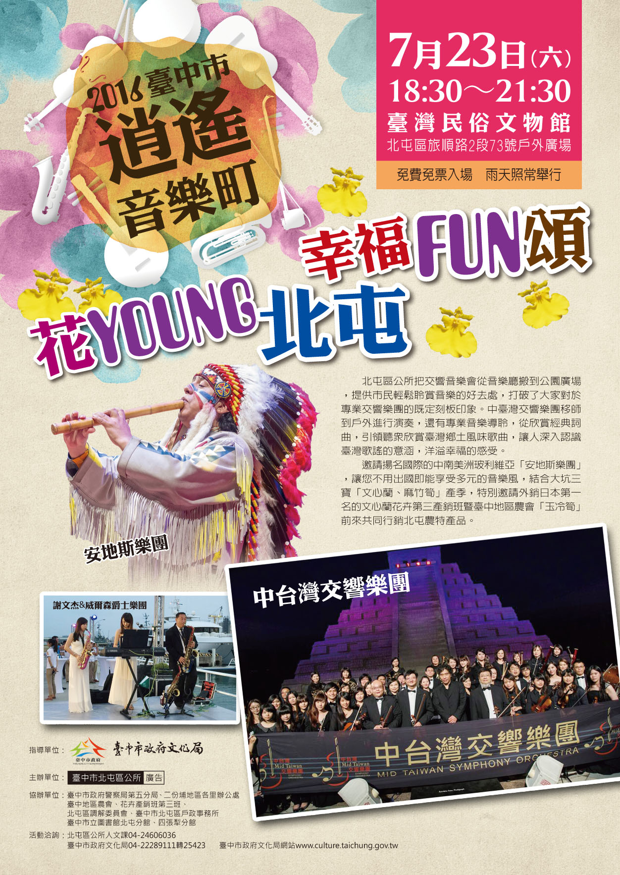 將「中臺灣交響樂團」移師到戶外進行演奏,把交響音樂會從音樂廳搬到公園廣場,打破大家對於專業交響樂團的既有刻板印象,並有專業音樂導聆,從欣賞經典詞曲引領聽眾欣賞臺灣鄉土風味歌曲,讓人深入認識臺灣歌謠的意涵,洋溢幸福的感受。另邀請揚名國際的中南美洲玻利維亞「安地斯樂團」及謝文杰&威爾森爵士樂團,讓您不用出國,就能享受多元的音樂風。於105年7月23日18時30分假臺灣民俗文物館戶外廣場舉辦,邀您免費品味夏日戶外音樂會。 聯絡人:課員 許清福 聯絡電話:04-24606000~6338