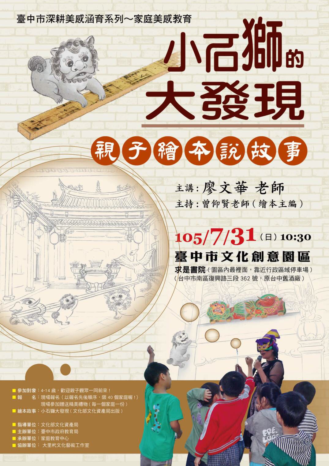 (一)小石獅大發現-親子繪本說故事活動:7月31日(日)上午10:30至12:30,現場報名額滿為止。