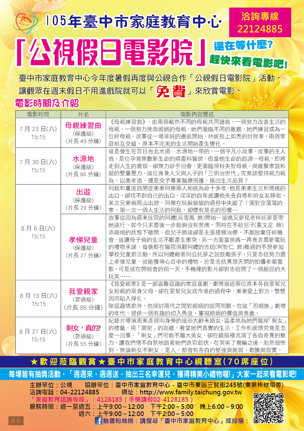 臺中市家庭教育中心謹訂本(105)年7月23日(六)至8月27日(六)舉辦「公視假日電影院」(場次如附件DM),敬請轉知所屬踴躍參加!