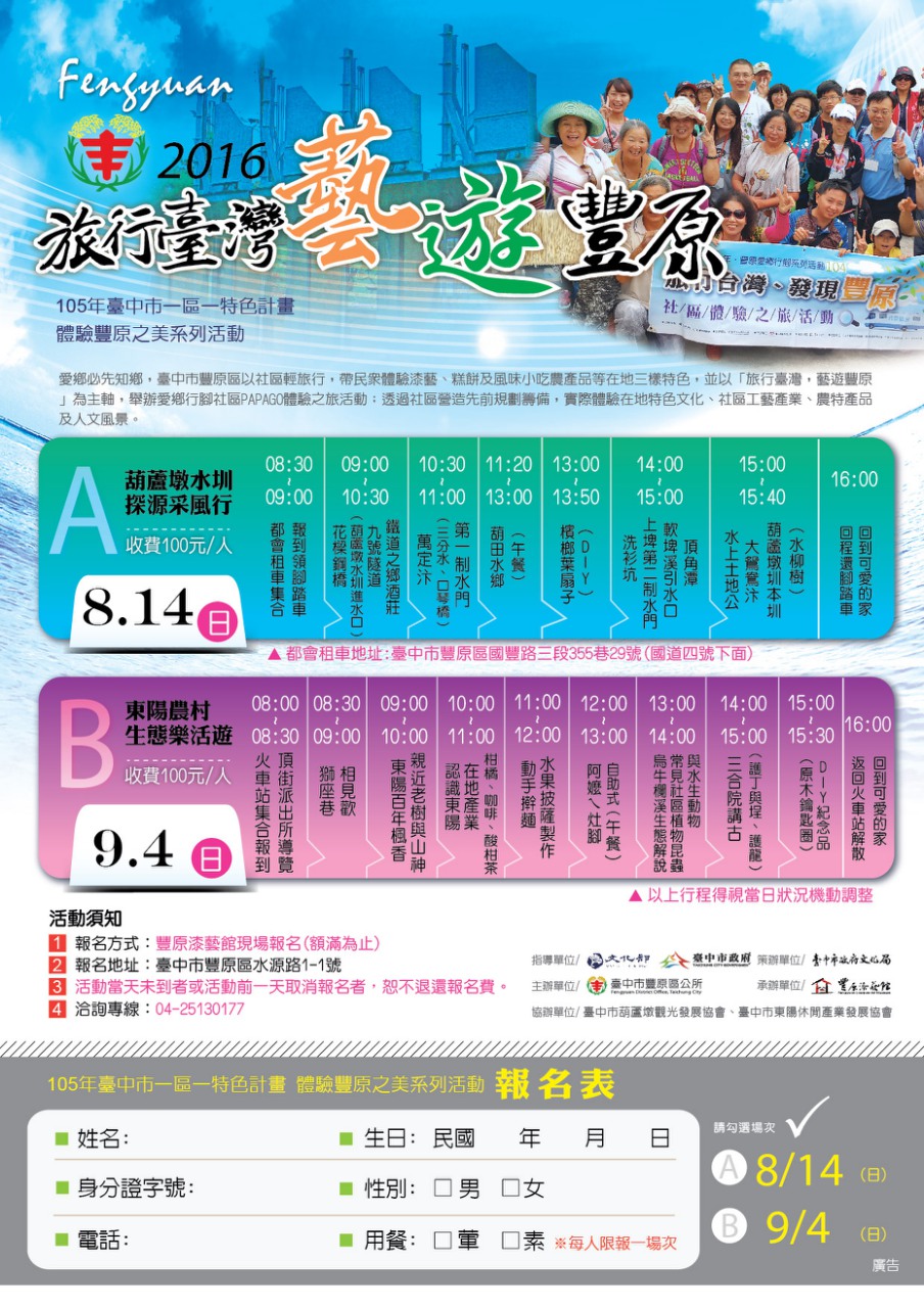 豐原區公所辦理105年度一區一特色計畫「2016豐原囝仔來講」系列活動「旅行台灣,藝遊豐原」惠請協助宣傳周知並鼓勵所屬踴躍報名參加。