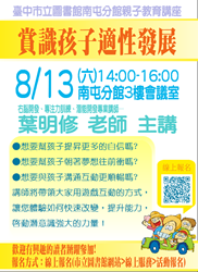 一、本館南屯分館訂於本(105)年8月13日(六)舉辦「賞識孩子適性發展」親子教育講座,邀請具備右腦開發、專注力訓練、潛能開發專才的葉明修老師,以遊戲互動的方式帶領大家瞭解孩子的人格特質,增近親子溝通,並體驗如何快速改變、提升能力,啟動潛意識強大的力量。二、時間:105年8月13日(六)下午2時至4時。三、地點:臺中市立圖書館南屯分館3樓會議室(臺中市南屯區大墩十二街361號)。四、公教人員全程參與者核予終身學習時數2小時。五、檢附本講座文宣乙份。 聯絡人:林品慧 聯絡電話:04-22533836