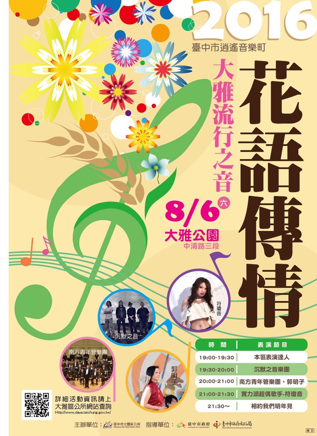 臺中市大雅區公所訂於本(105)年8月6日(星期六)晚上7時辦理「2016臺中市逍遙音樂町─大雅流行之音~花語傳情」音樂會。一、活動地點:大雅公園(臺中市大雅區中清路三段)。二、此次活動特別邀請超偶實力派歌手「粉紅坦克-符瓊音」、「小鄧麗君-郭明子」、「南方青年管樂團」及本市立案創作樂團~「沉默之音」輪番上場,讓民眾一次回味老中青三代有關「花」的流行音樂並於活動中穿插「花語」有獎徵答。