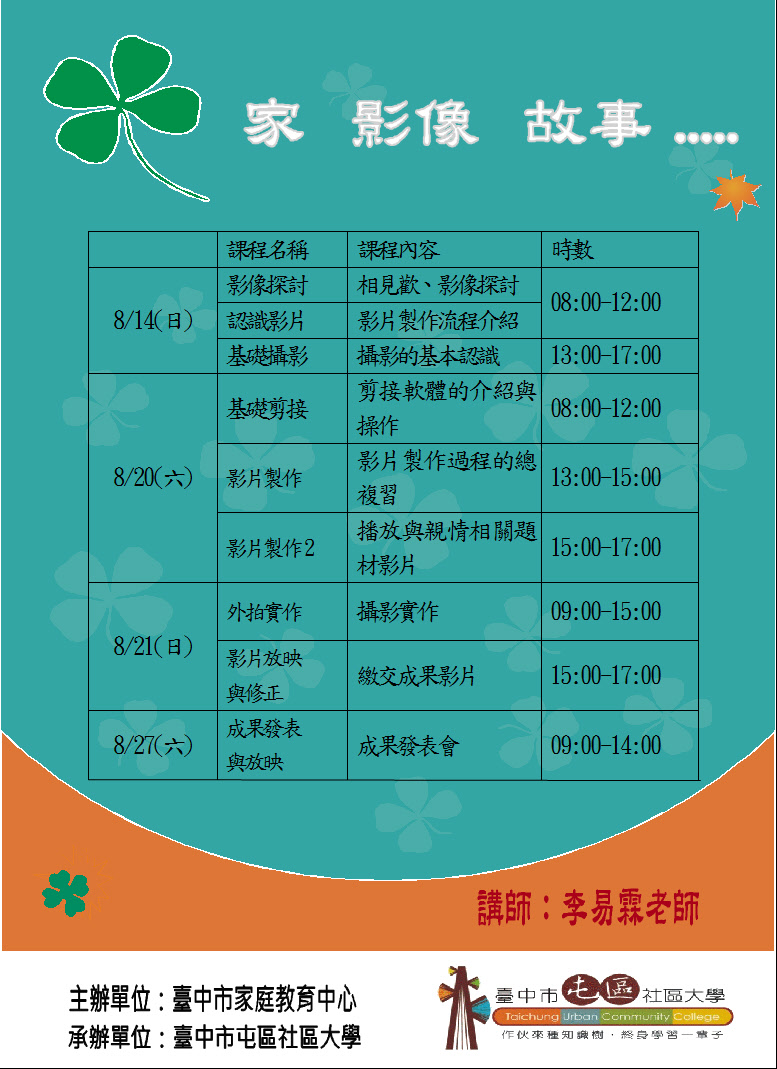 一、課程時間:8月14日(日)、8月20日(六)、8月21日(日) 、8月27日(六)。二、上課地點:臺中市屯區社區大學(臺中市立大里高中內)三、請惠予協助播放跑馬燈內容:「您是否有許多點點滴滴的回憶,不知如何記錄?臺中市家庭教育中心8/14、8/20、8/21、8/27在屯區社區大學辦理「家庭影像故事」攝影與影片剪輯課程,教您如何拍攝及製作感人、溫馨的影片,讓您成為影片製作達人!課程免費,歡迎報名~報名專線:24074600」 聯絡人:范豈瑗 聯絡電話:(04)22124885 #204